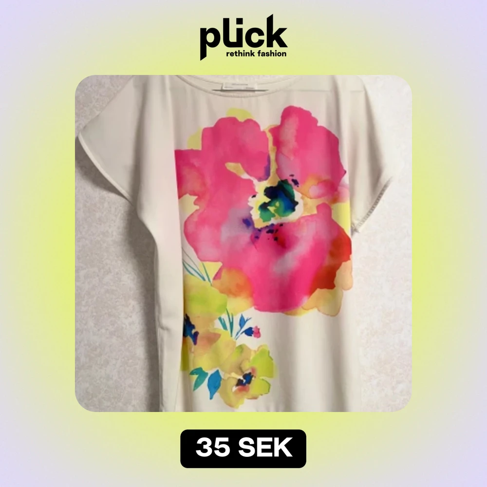 Säljer en vit blus med ett stort, färgglatt blommönster på framsidan. Toppen har korta ärmar och en lös passform, perfekt för en avslappnad och somrig look.