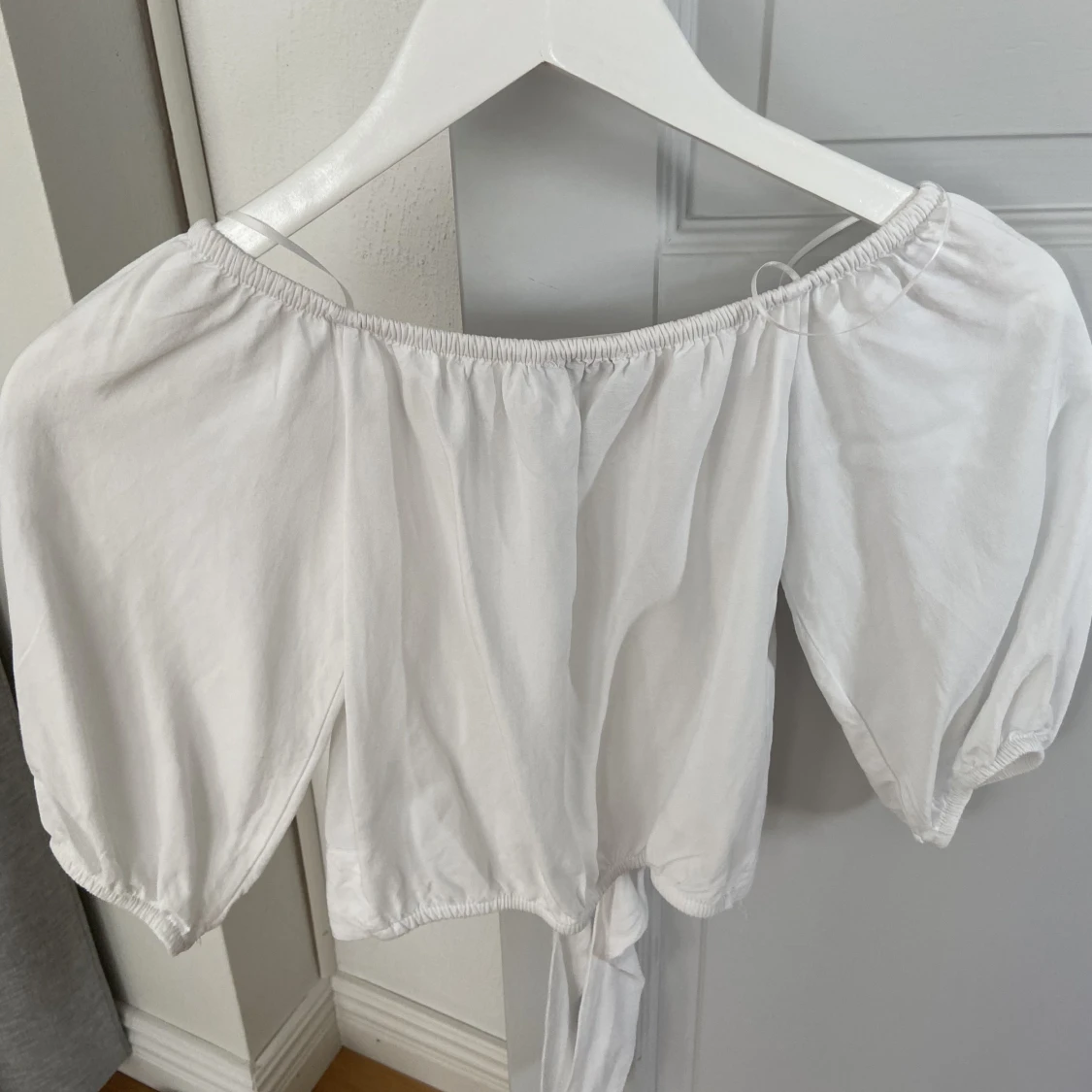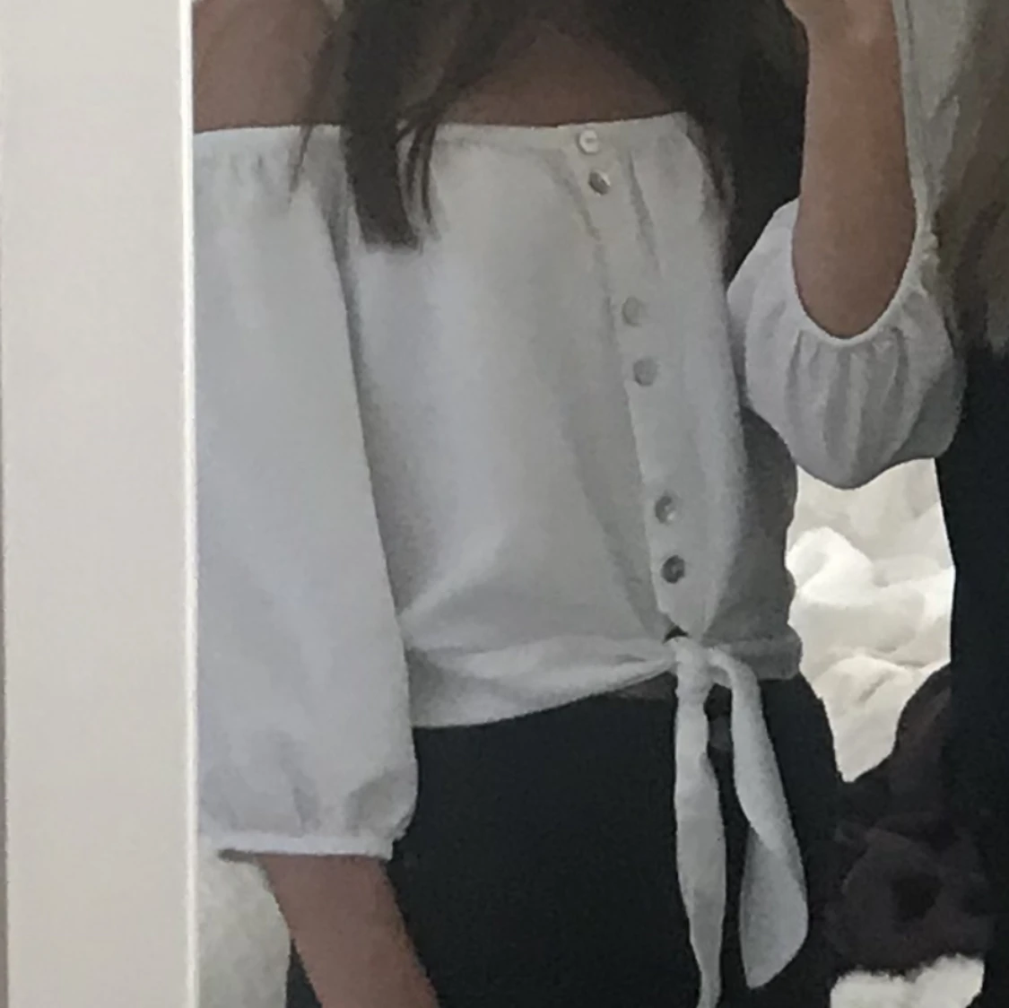 Vit blus med knappar och knytning framtill från Bershka. Kan användas både off-shoulder och vanligt. Använd fåtal gånger.