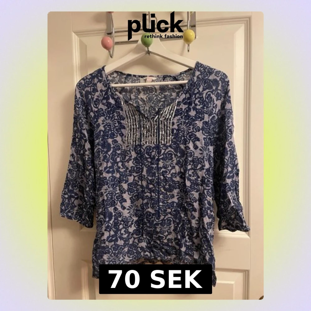 Söt blå trekvartsärmad blus med snören från märket Esprit! Köpt secondhand och endast använd en gång.