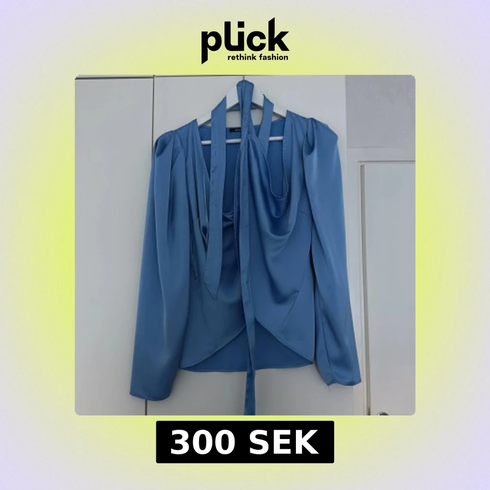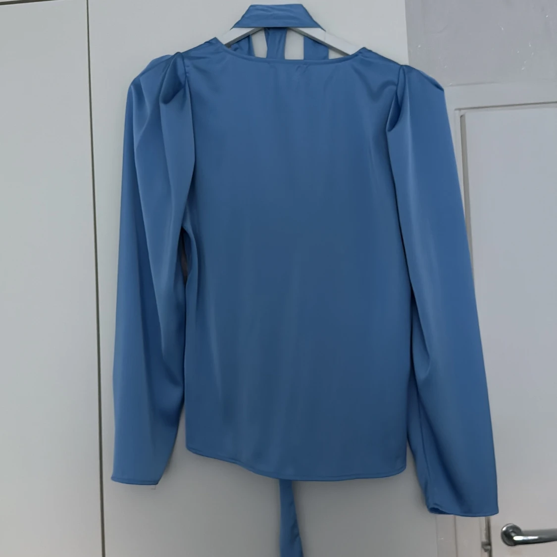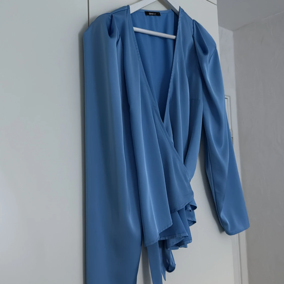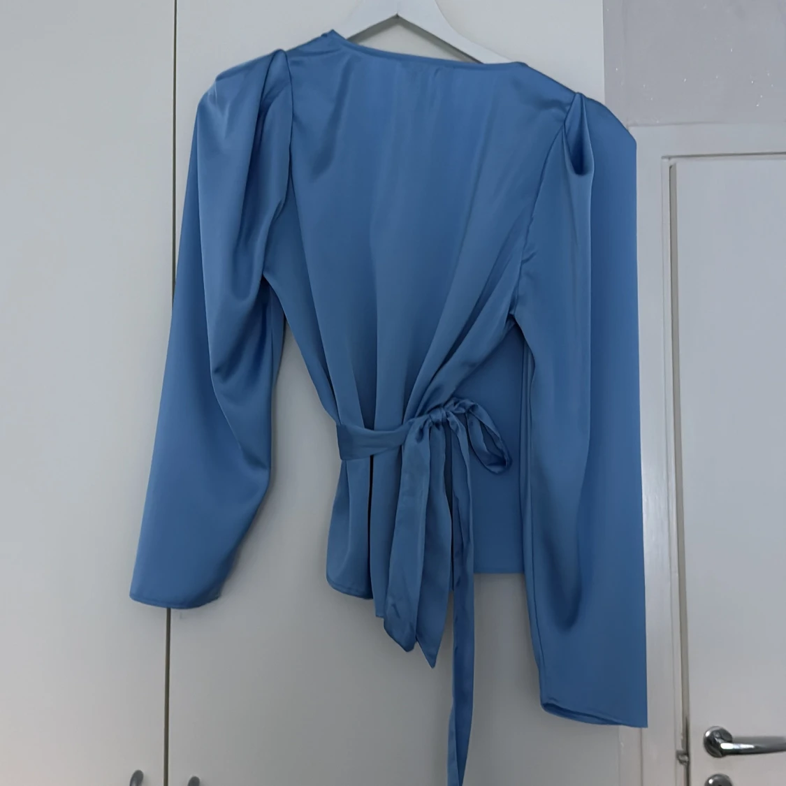 Supersnygg blå omlottblus i satinmaterial från Gina Tricot. Blusen har långa ärmar, markerade axlar och knytband i midjan som ger en riktigt chic siluett. Djup v-ringning framtill och lätt puff vid axlarna för extra stilpoäng.
