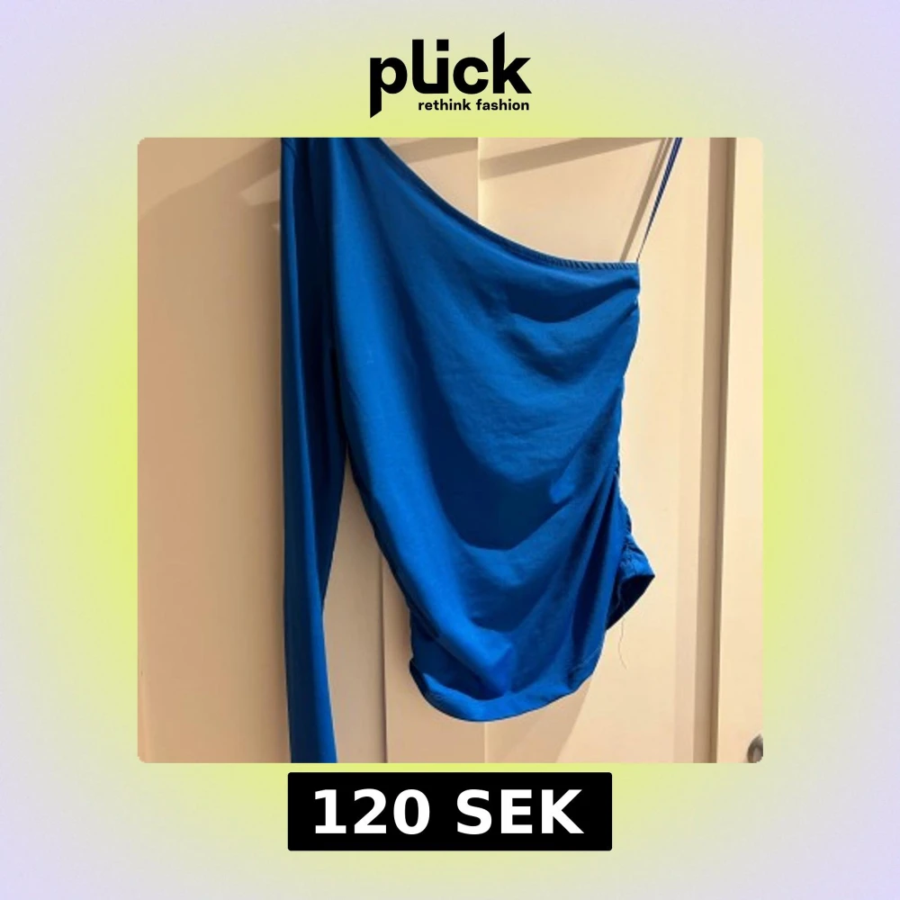 Snygg blå topp från Gina Tricot med oneshoulder-design och en lång ärm. Toppen har rynkade detaljer på sidan och är tillverkad i ett mjukt, stretchigt material som sitter skönt på kroppen. Perfekt för dig som vill sticka ut med en cool och modern look.