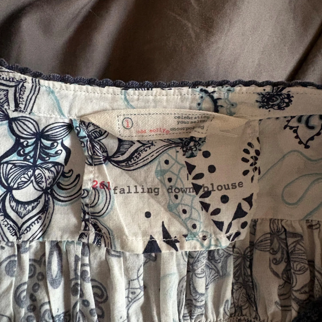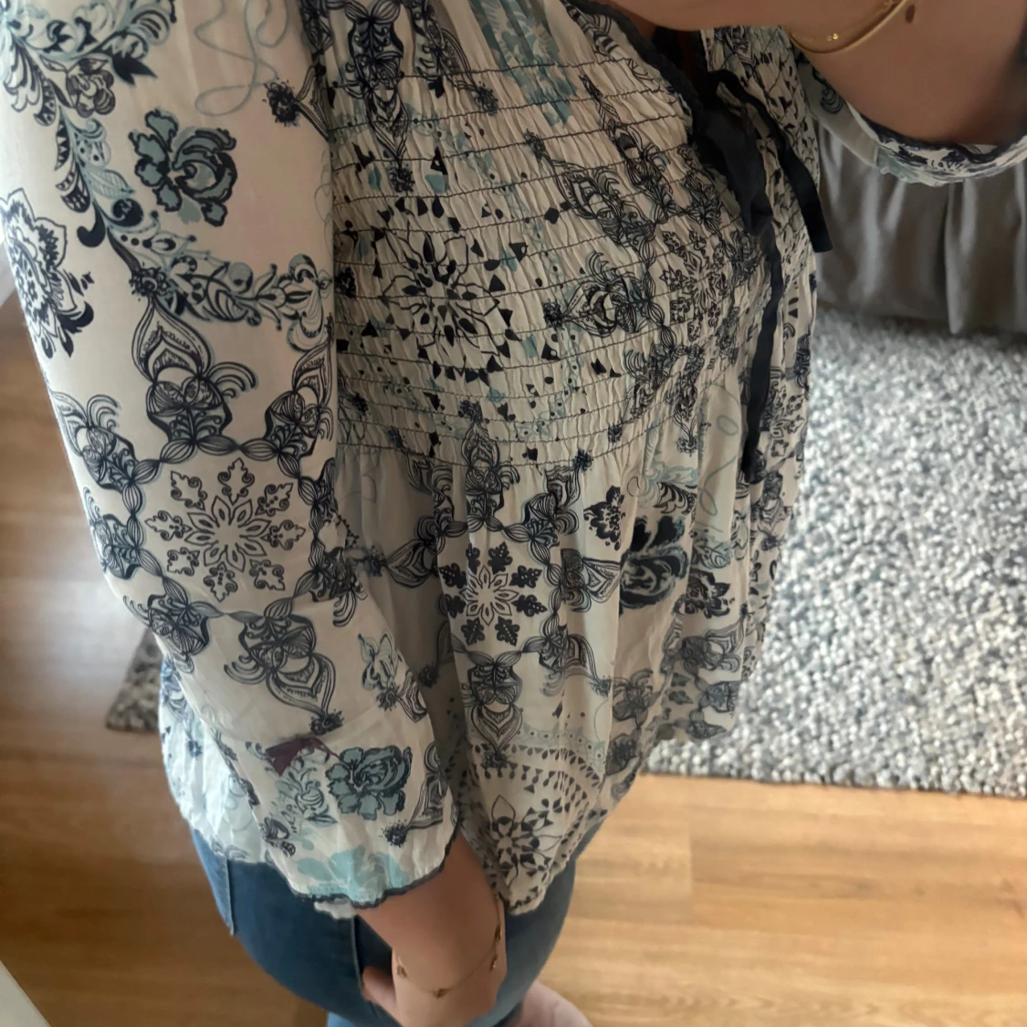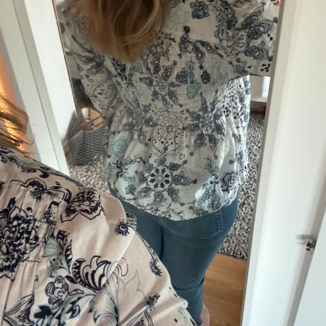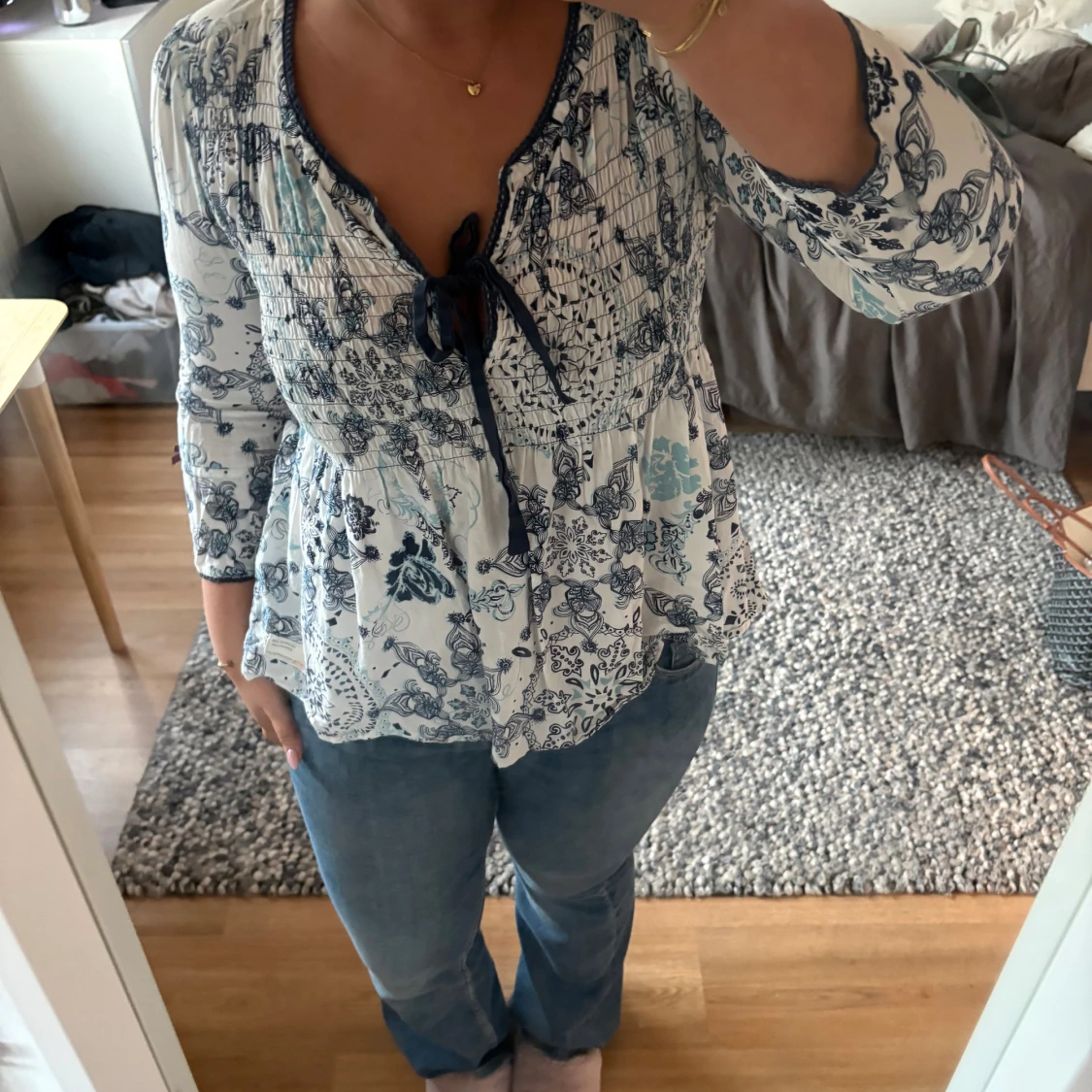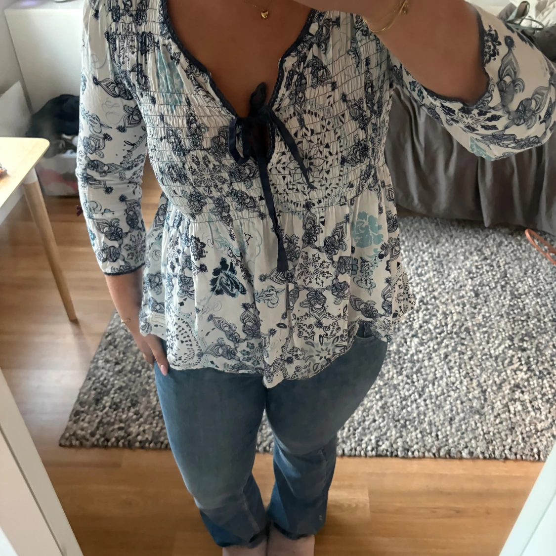 Supersöt blus i vitt med blått mönster. Blusen har trekvartsärm, v-ringning med knytband. Bra skick, storlek 1 som motsvarar S. Skriv vid frågor❤️
