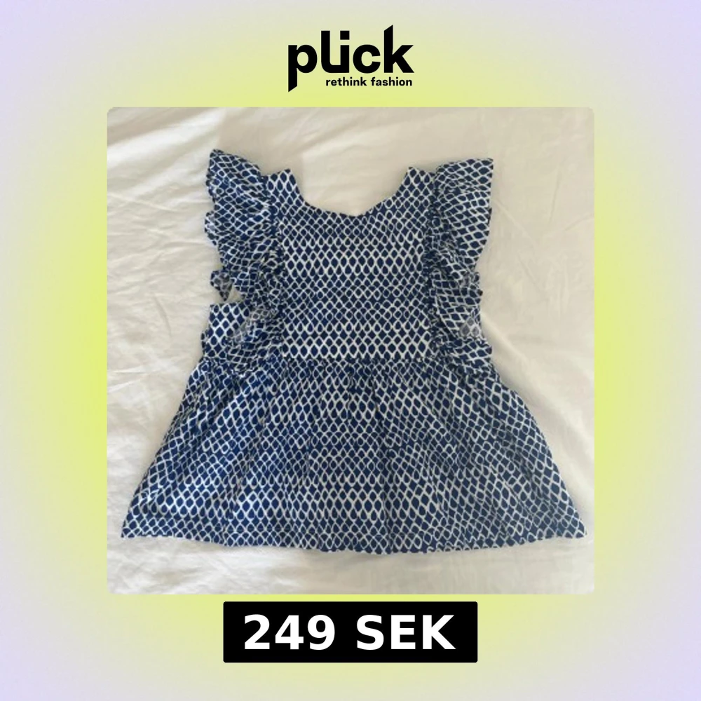 Supersöt blus från Mango i fin kvalitet med 89% bomull och 11% linne. Blusen är blåvit med snyggt mönster och volangärmar. Smockad rygg för extra komfort och stretch. Perfekt för varma sommar dagar. Blusen är i storlek 152 och passar på mig som är 173 cm lång och har en storlek xs, men skulle däremot säga att den passar bättre på någon med storlek xxs. Blusen har aldrig kommit till användning och är därför i nyskick.