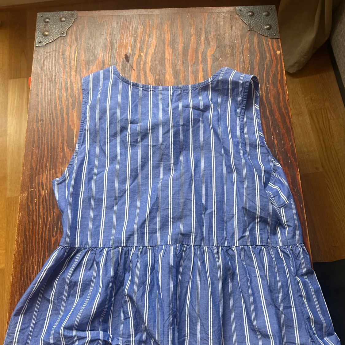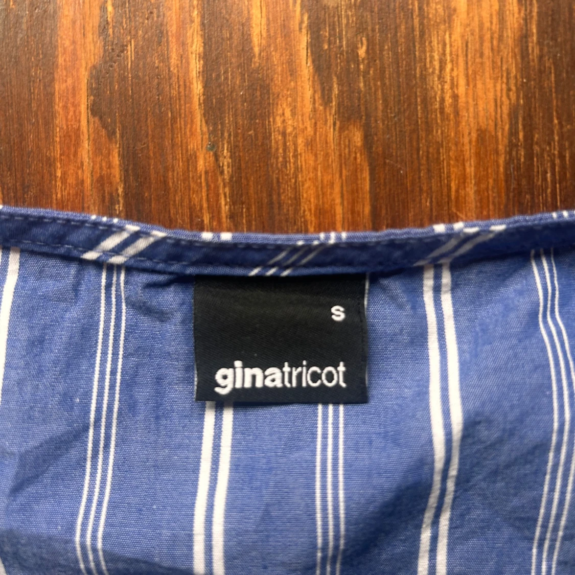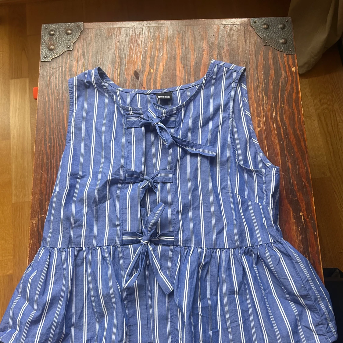 Superfin blå klänning med vita ränder från Gina Tricot. Ärmlös modell med flera knytningar framtill och lätt utställd kjol. Perfekt för varma dagar och har en luftig känsla tack vare bomullsmaterialet.