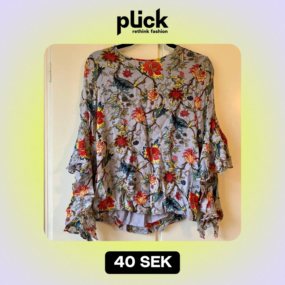 Ljusblå, blommig blus med volanger. Jättefin blus som passar till alla sammanhang! Krusiga volanger ger den en whimsical känsla.