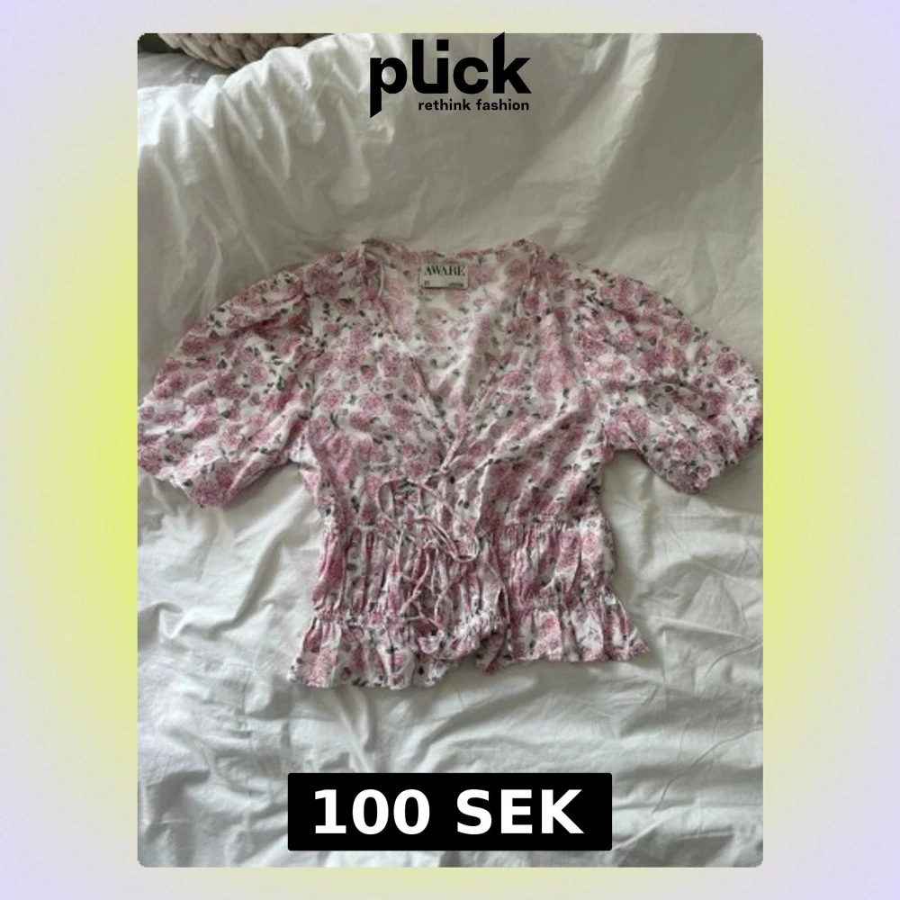 Blommig blus från Aware med puff ärm, v-ringning och knyte fram. Andvänd 1 gång