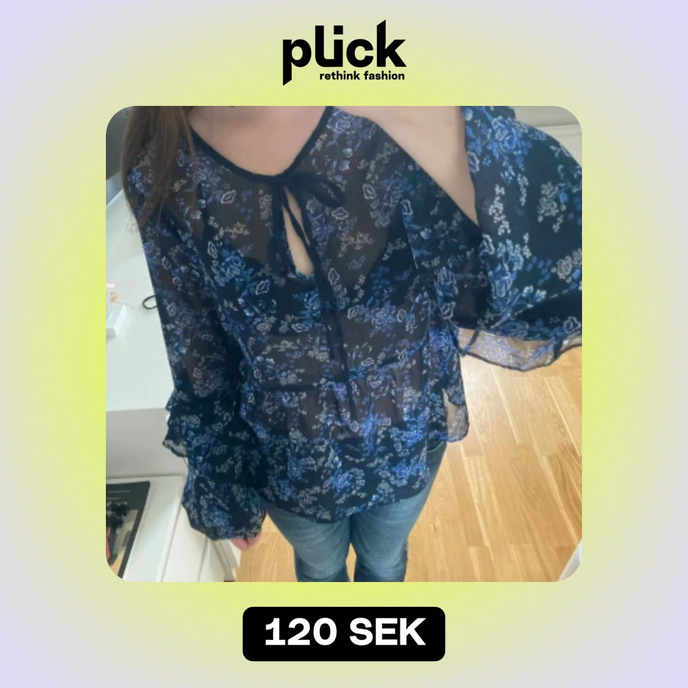 Så söt blus nu till sommaren! Marinblå med blåa och vita blommor, blusen har även band som knyts framtill