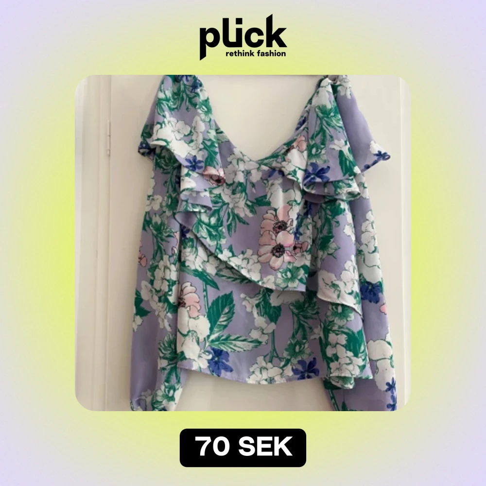 Säljer en superfin off-shoulder topp med blommigt mönster i lila, grönt och rosa. Toppen har volanger som ger en romantisk känsla och är perfekt för sommaren.