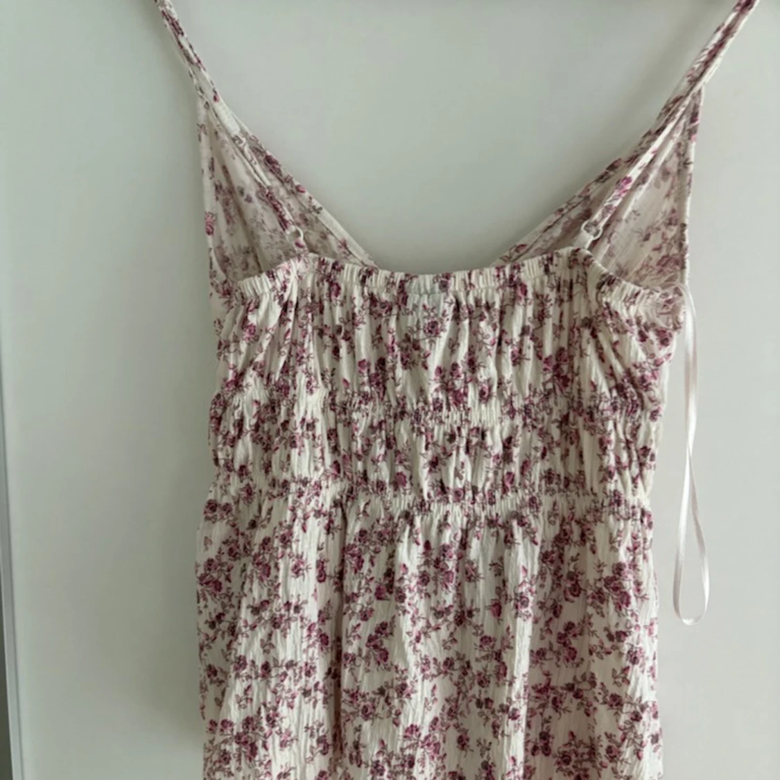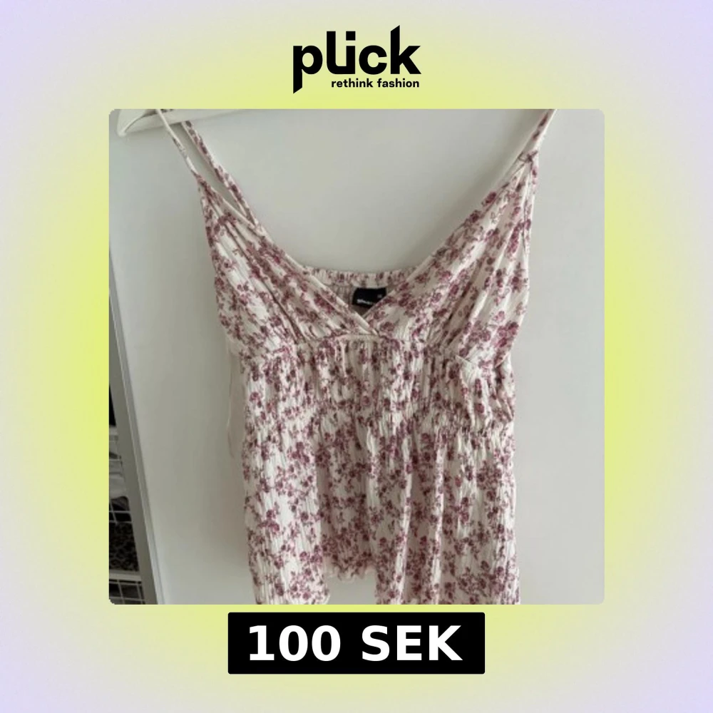 Supersöt topp från Gina Tricot i XS med smala axelband och v-ringning. Vit botten med små rosa blommor, smockad midja och lätt, luftig känsla. Perfekt för varma dagar och ger en romantisk vibe. Har endast använt 1 gång och säljer för att det va i fel storlek! 🤗❤️