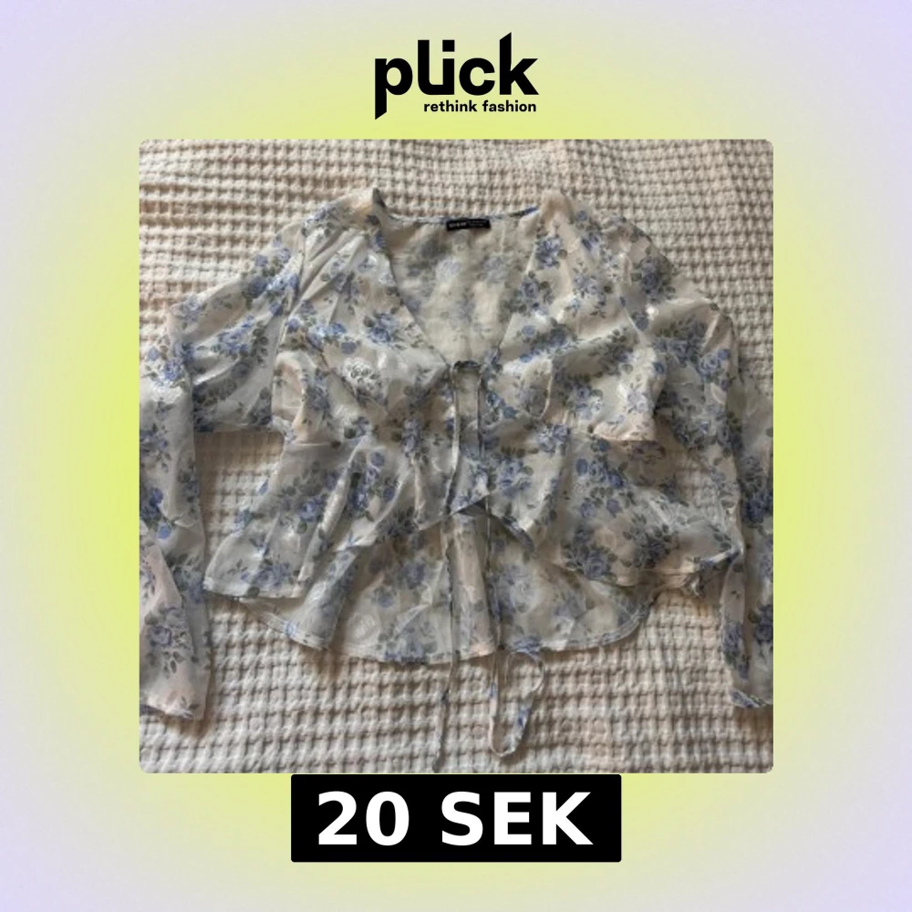 Säljer en superfin transparent blus från SHEIN med blått och vitt blommönster. Blusen har långa ärmar, volangdetaljer och knyt framtill. Perfekt för dig som gillar romantisk och luftig stil.