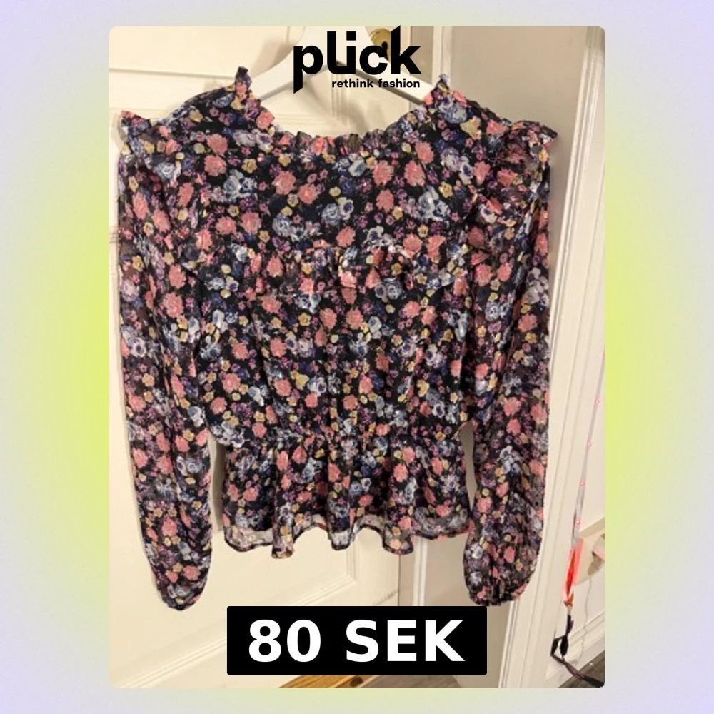 Supersöt blommig blus från Lindex i storlek 152. Svart botten med rosa, lila, blå och gula blommor, volangdetaljer vid axlar och bröst samt lång ärm. Blusen har en lätt och luftig känsla, perfekt för dig som gillar romantisk stil.