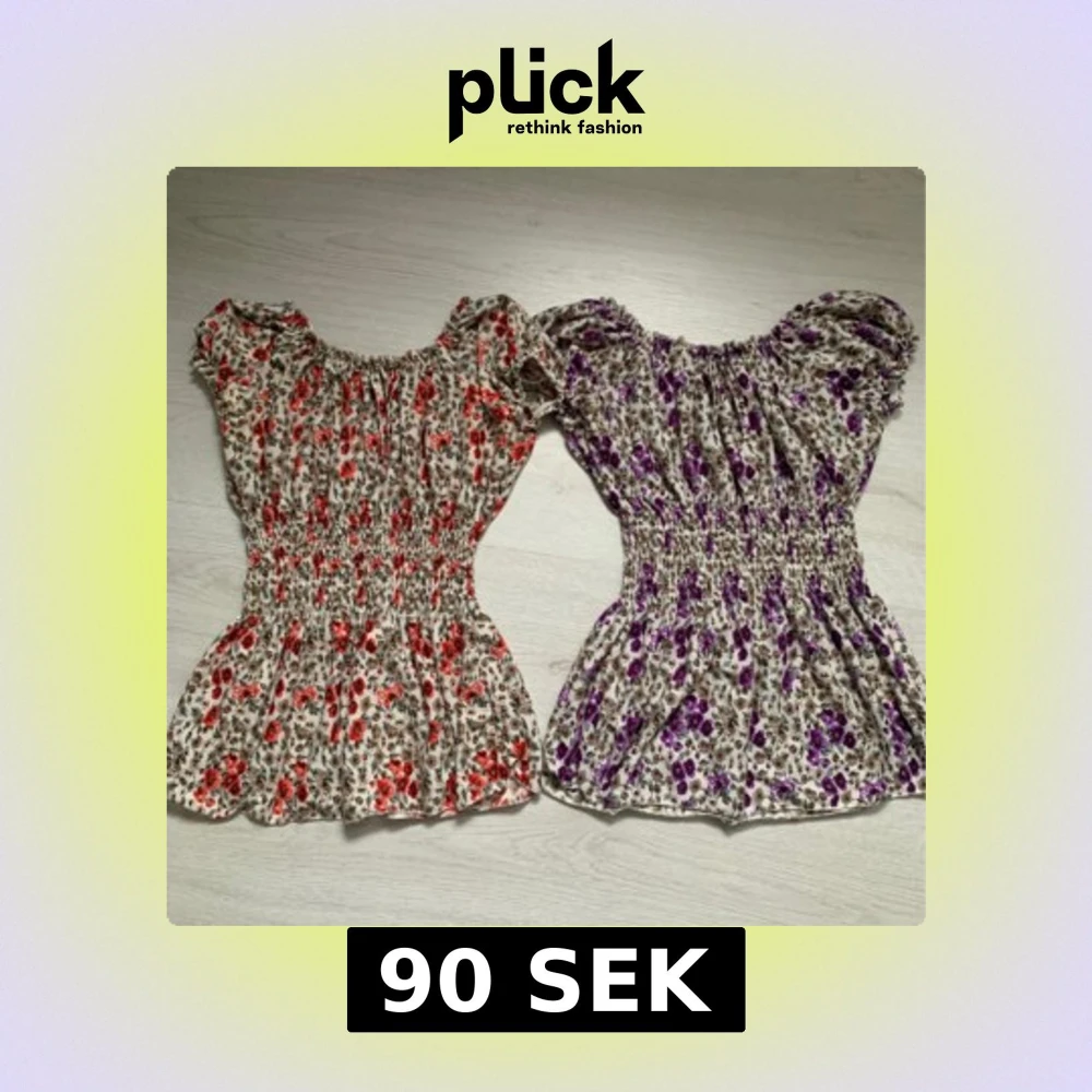 Två blommiga blusar med smockdetaljer i midjan. Den ena har röda blommor och den andra lila. Båda topparna har korta ärmar och en luftig passform, perfekt för varma dagar.