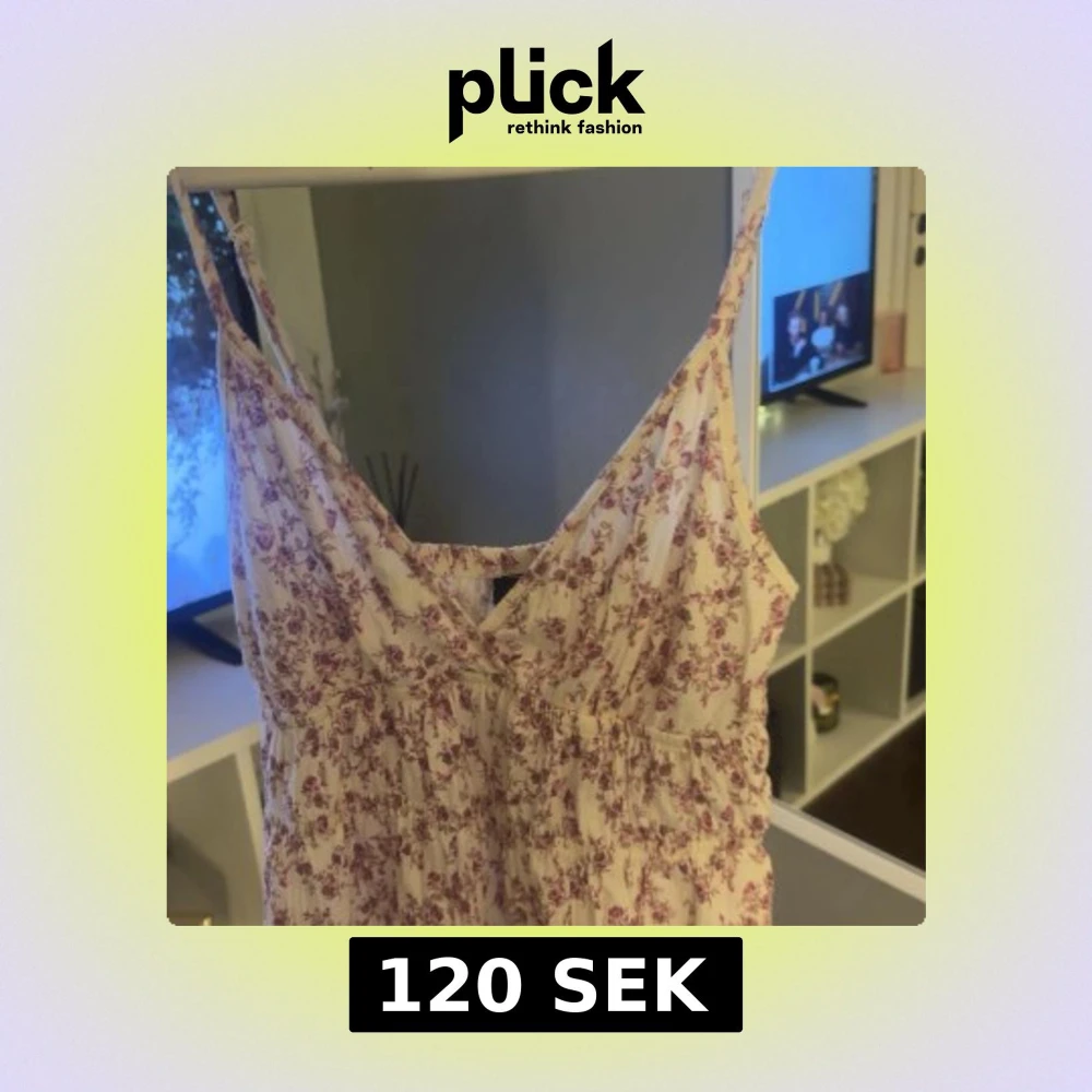 Supersöt kort klänning från Gina Tricot i storlek XS. Klänningen är vit med små rosa blommor, har smala axelband och v-ringning. Perfekt för varma dagar och har en lätt, luftig känsla tack vare bomullsmaterialet. Nypris: 299