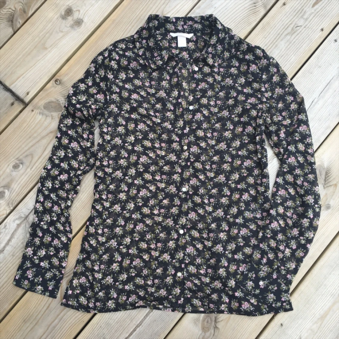 Blus i chiffong svart botten med små söta blommor. Liten frill udd på rundad krage. Så snygg enkel till denim.