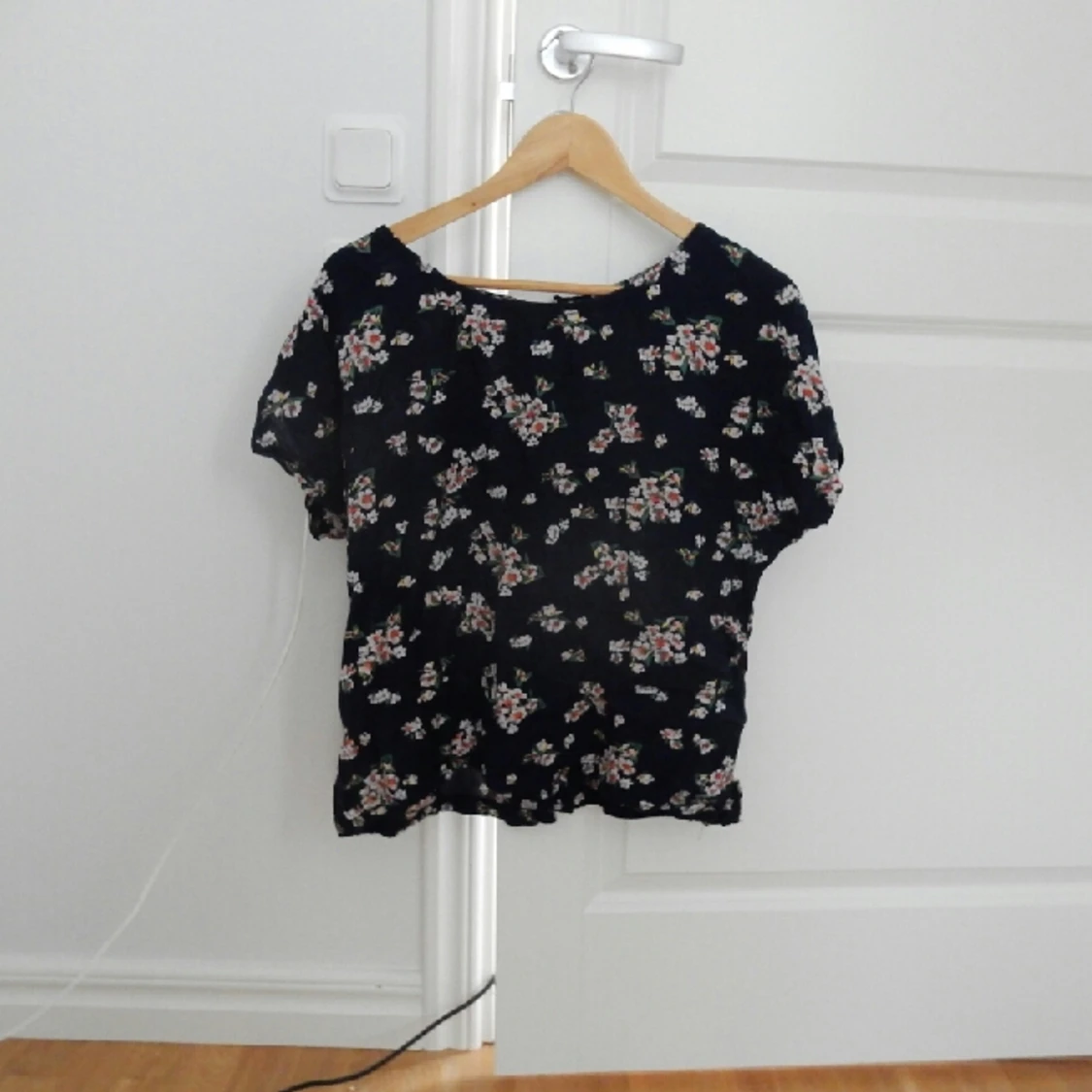 Kortärmad mörkblå blus med blommor från Lindex. Använd men fortfarande fin. Knappar i ryggen.