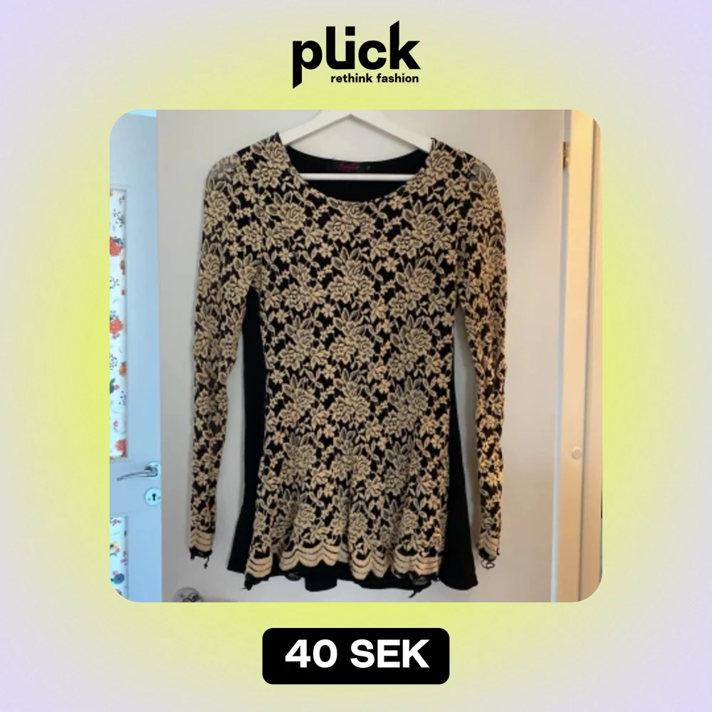Fin blus med spets, svart och beige. Storle L men det är ganska liten och har stretchig material. Skön att ha på sig.