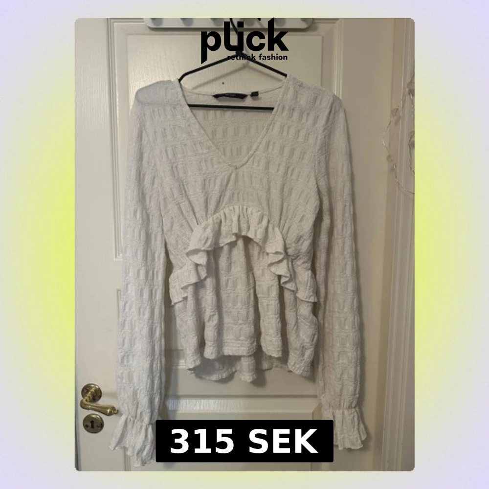 Supersöt vit blus från VeroModa med volangdetaljer framtill. Blusen har v-ringning och långa ärmar med volang vid ärmslut. 💋