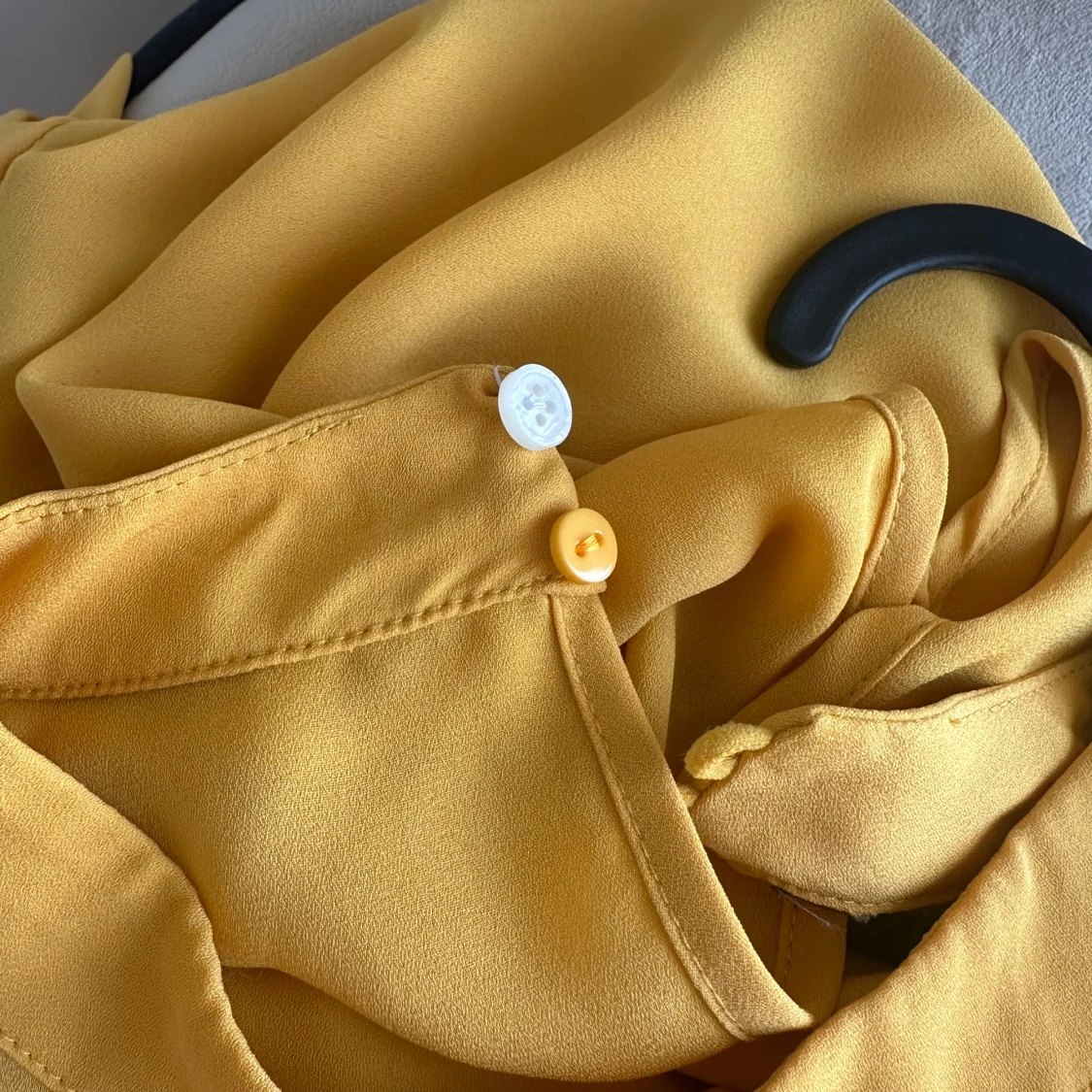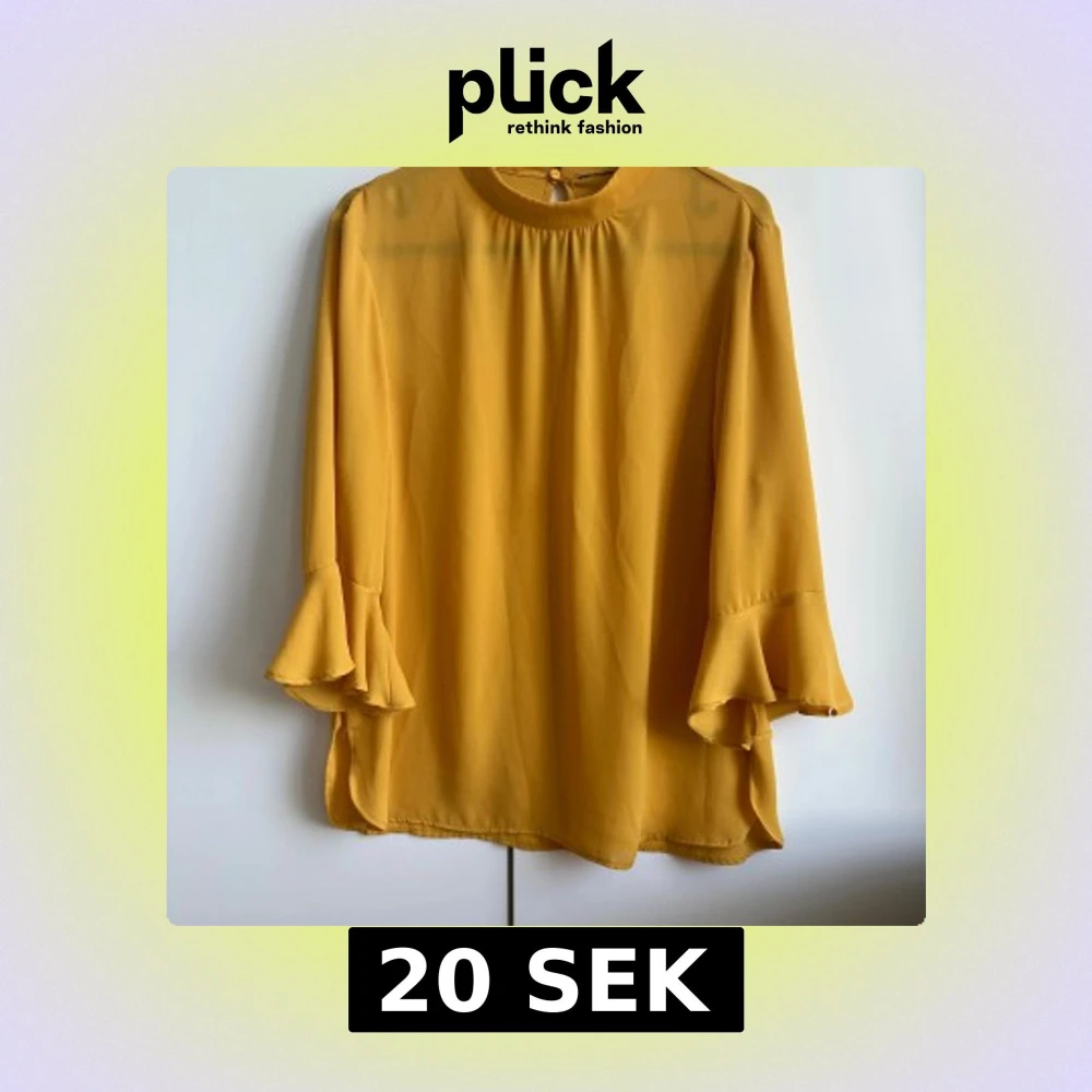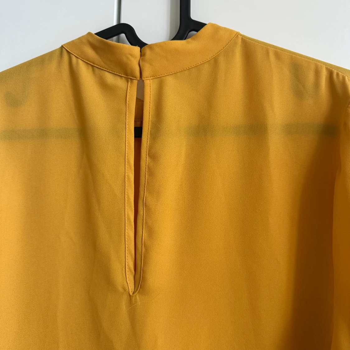 Senapsgul blus med volanger. Sytt på en vit knapp i nacken, inget som syns när tröjan är på.