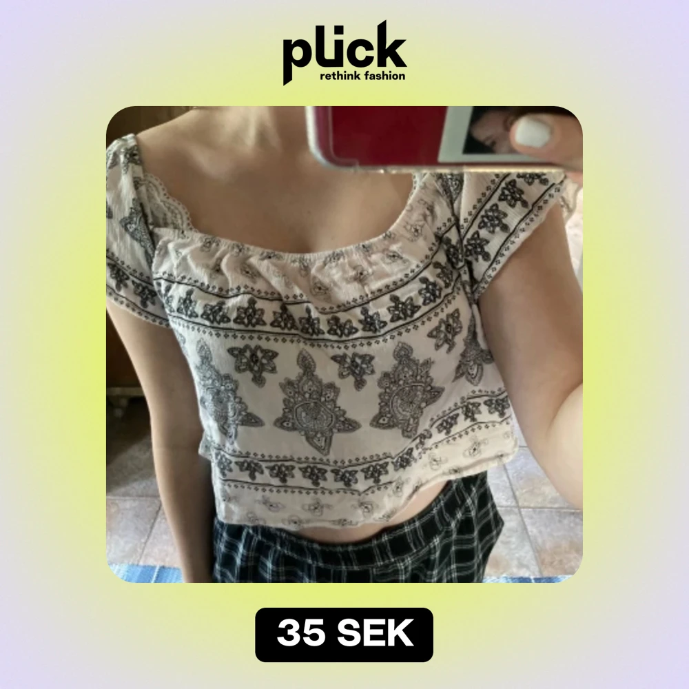 Gullig topp från Gina Tricot. Finns ingen storleksmärkning men skulle säga att den är S/M men kan även passa någon med större storlek då det är stretchigt material. Är köpt second hand men knappt använd och är i väldigt bra skick.