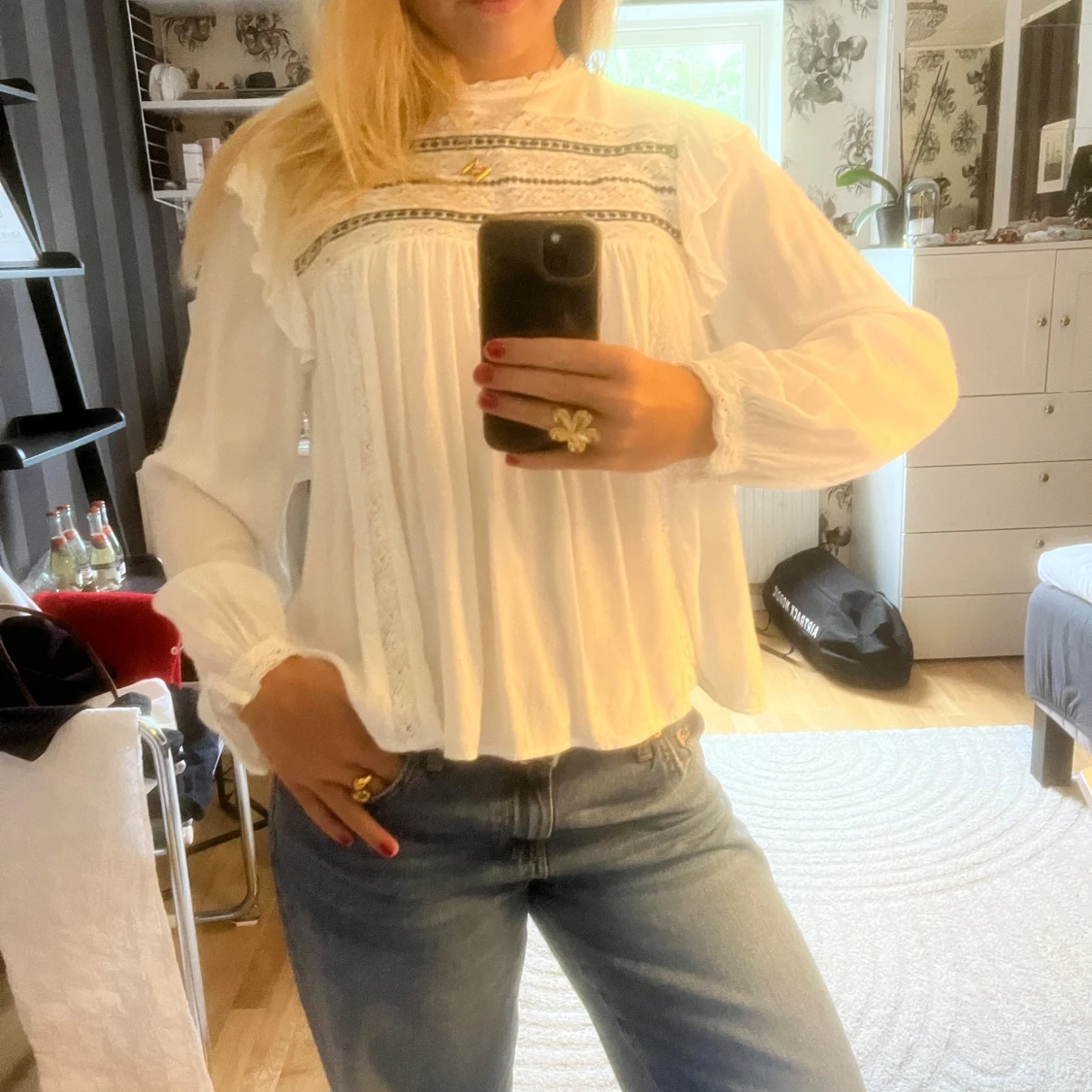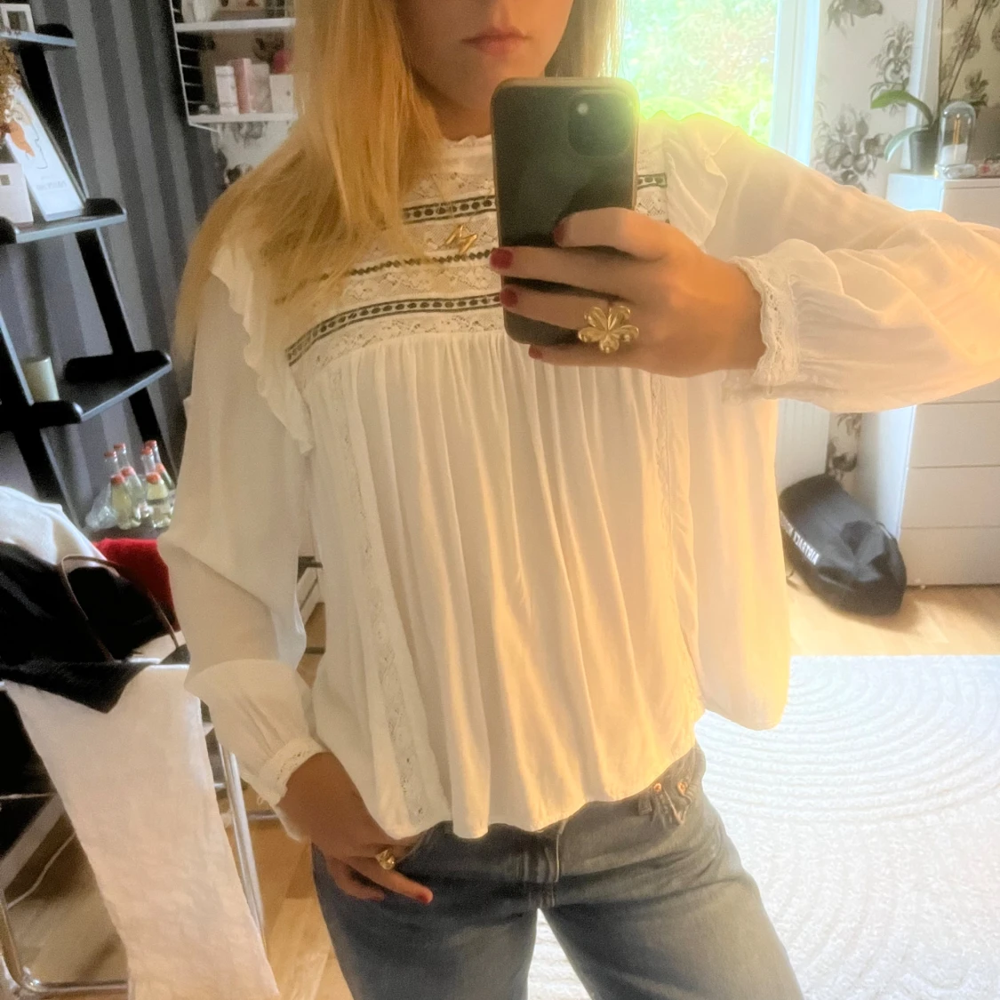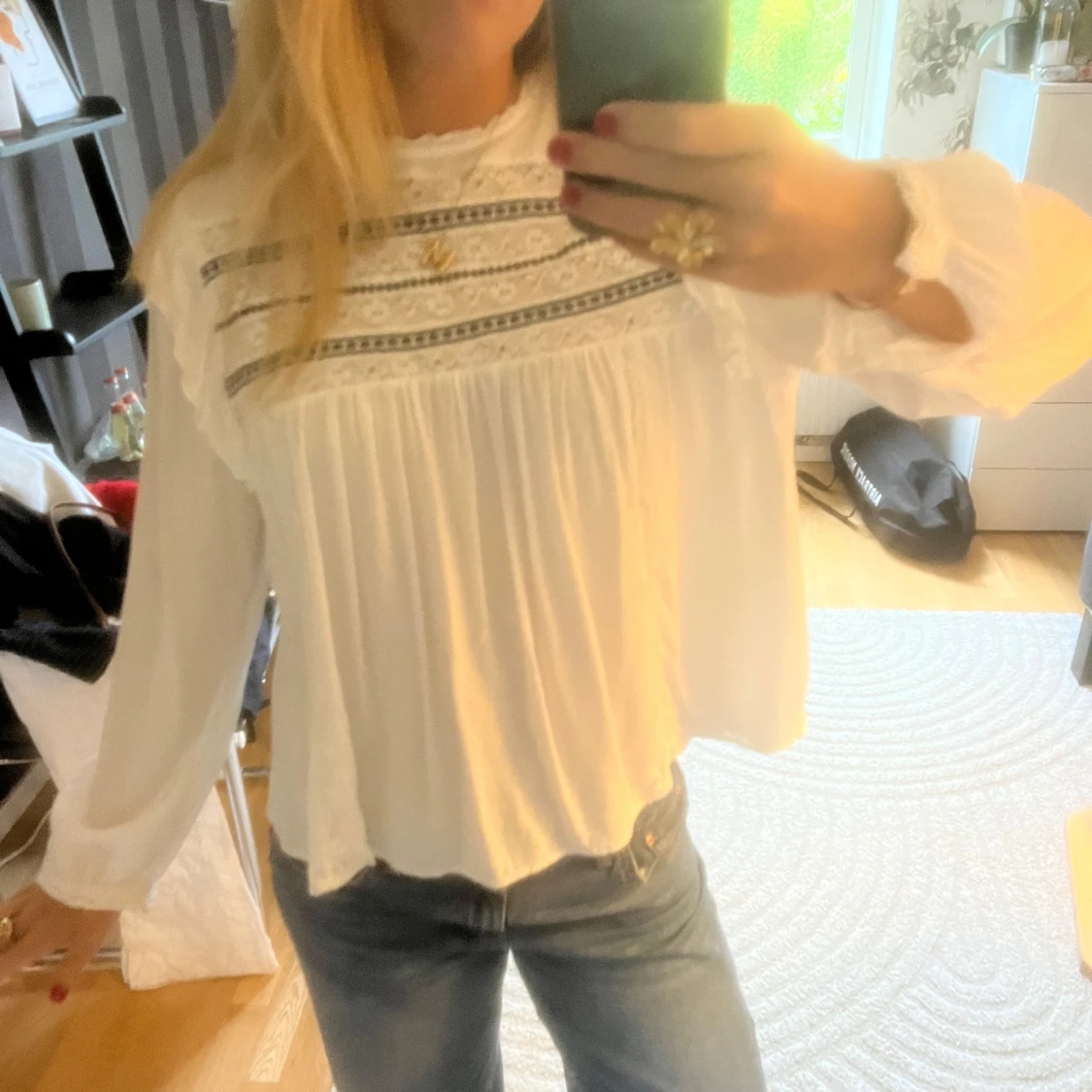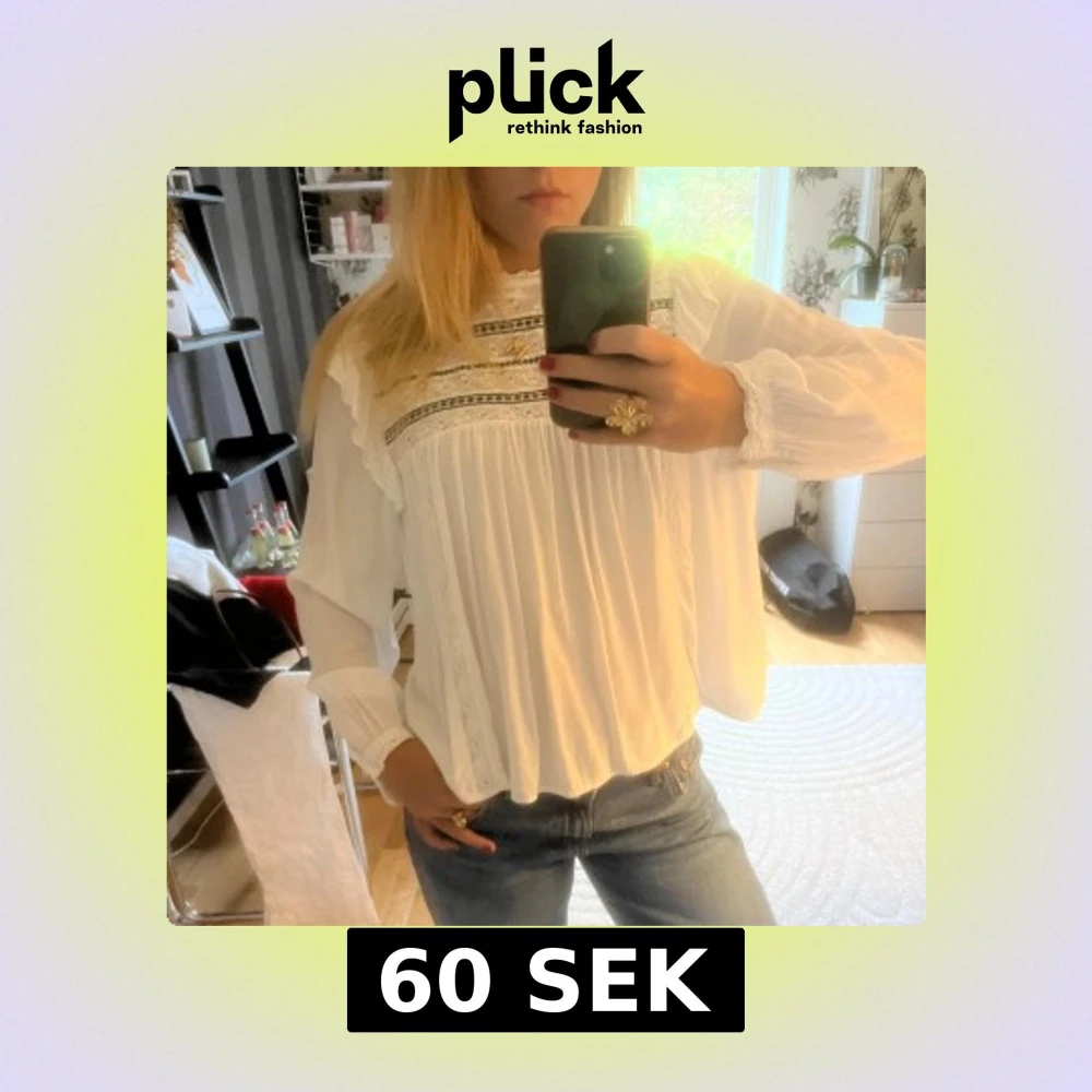 Söt vit blus som jag köpt second hand! En liten svag brun fläck på framsidan men inget som syns. Pris kan diskuteras 🩵