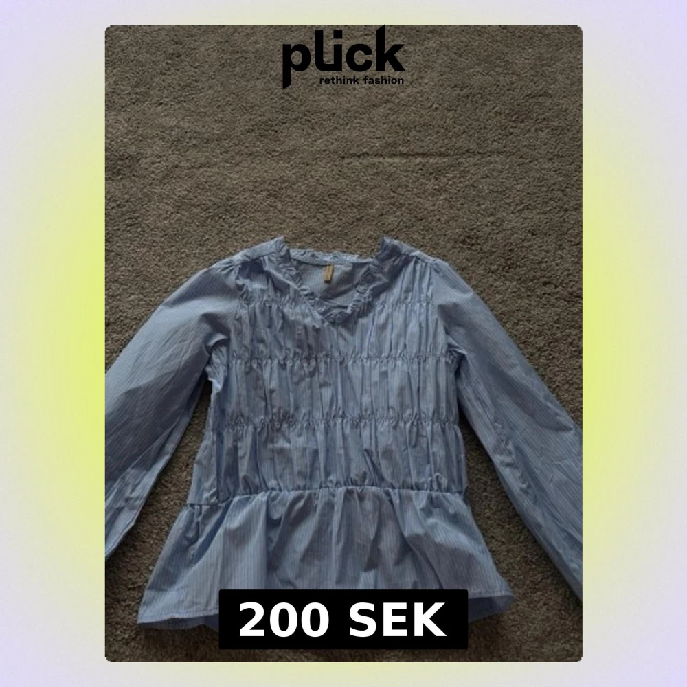 Ljusblå blus med tunna vita ränder och volang nedtill. Blusen har v-ringning och långa ärmar. Linne material. Perfekt till sommaren. Säljer för aldrig kommit till användning.