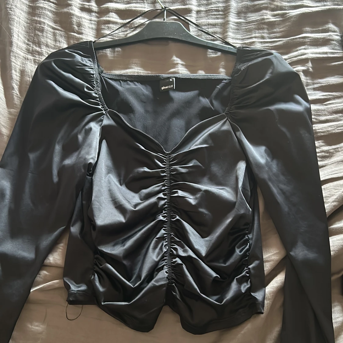 Svart blus från Gina tricot storlek XL Nyskick använd en gång. Stretchigt matrial och formar bröstet super fint!