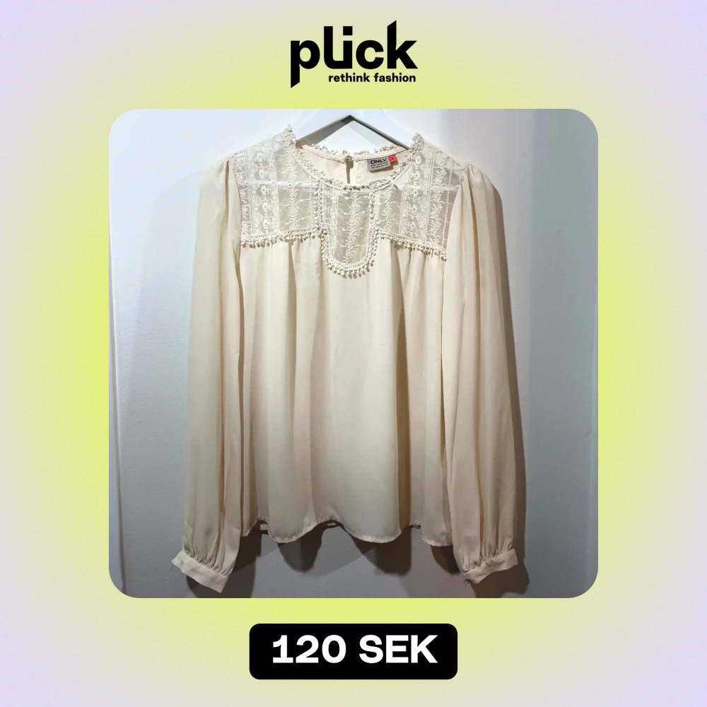 Benvit, tunn blus med vacker spets i halsen. Fin guldknapp med pärla i nacken. Fina ärmar med samma knappar som baktill. Perfekt till kjol eller byxa.