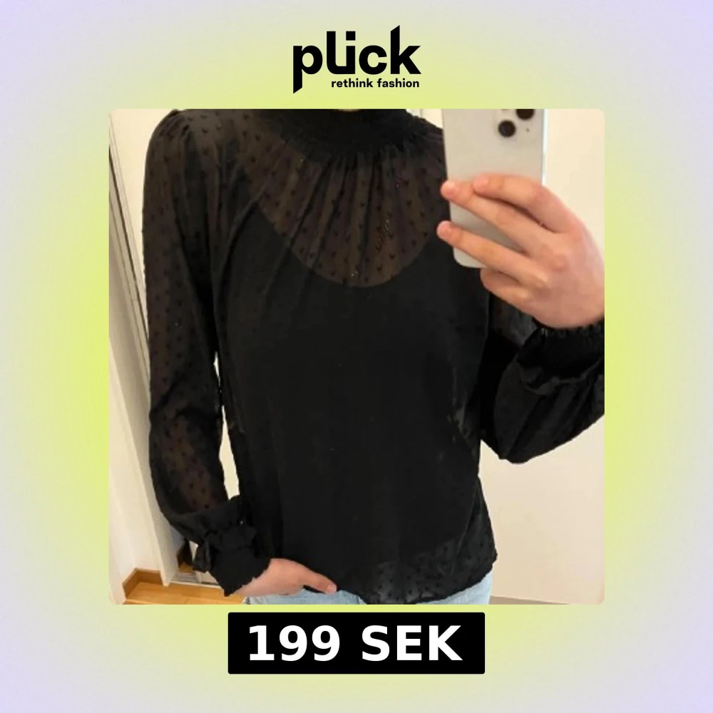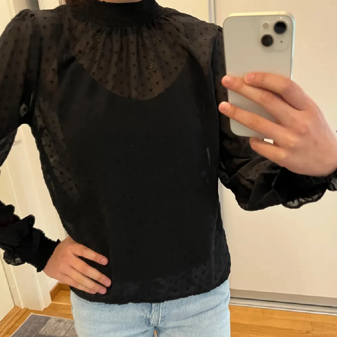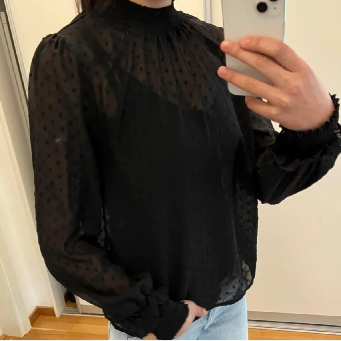 Säljer en superfin mesh/genomskinlig svart blus med ett hjärtmönster. Blusen har långa ärmar och en hög krage med smockdetaljer vid halsen och ärmarna. Perfekt för både vardag och speciellare tillfällen!💕