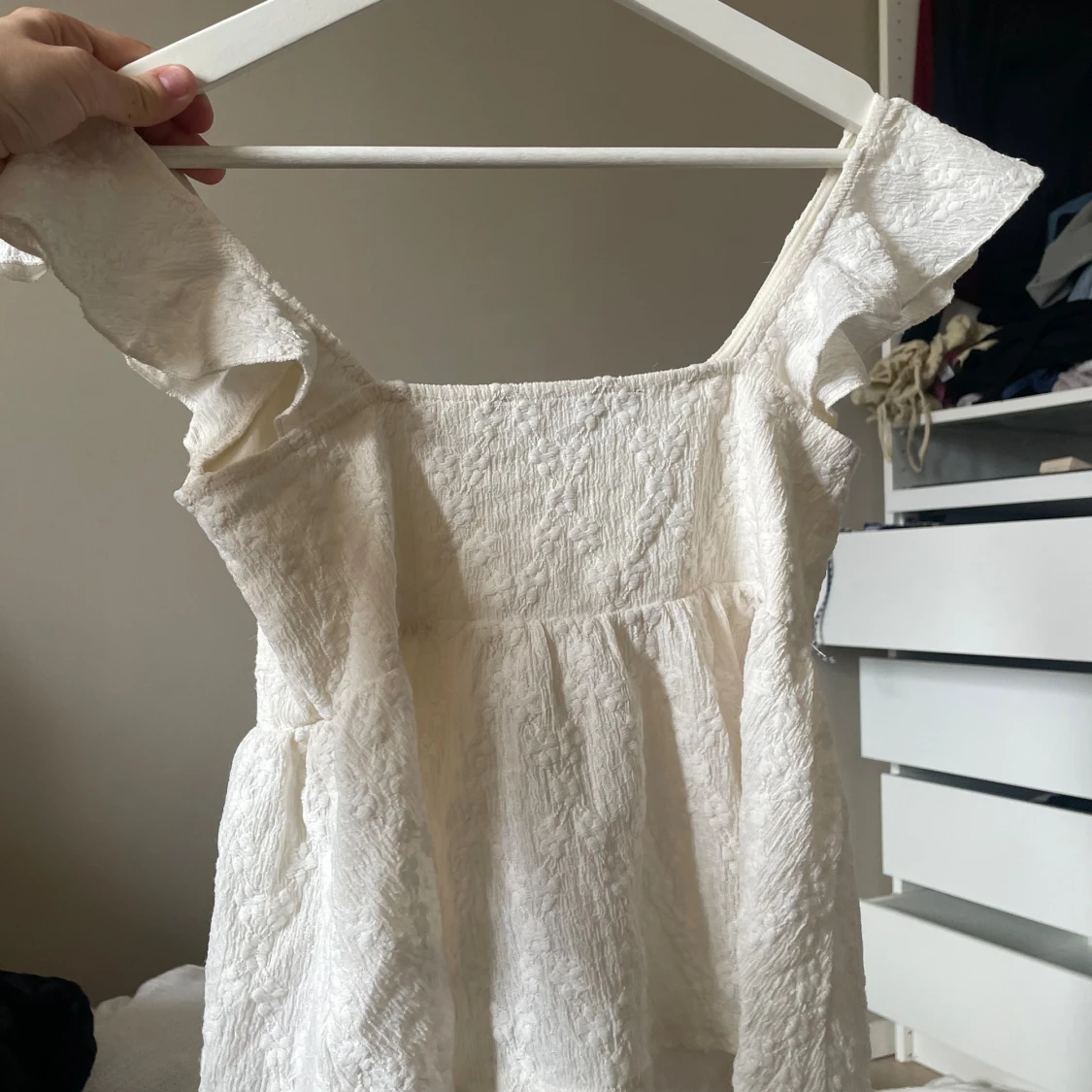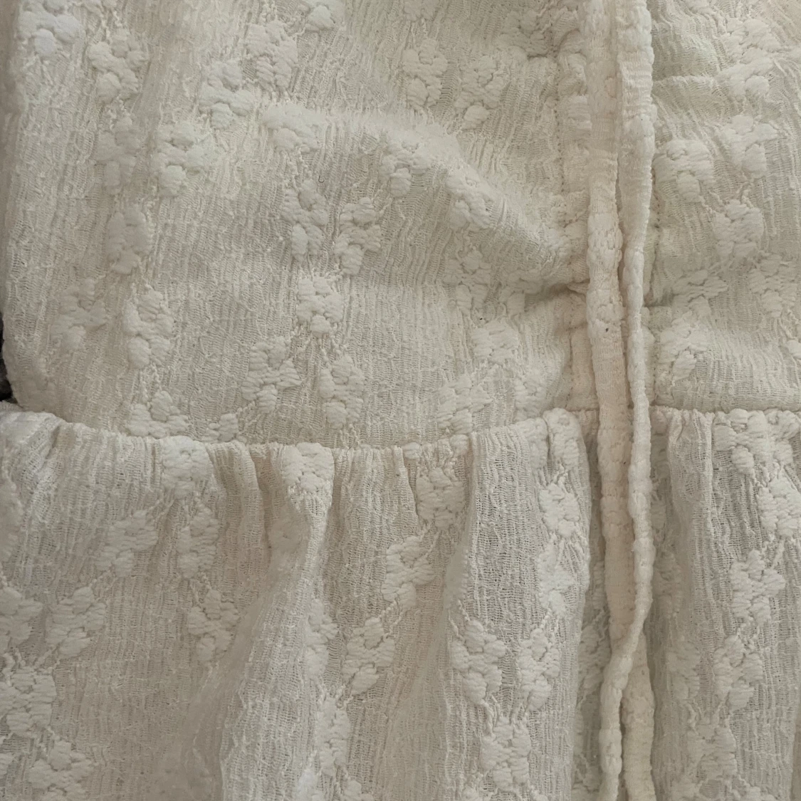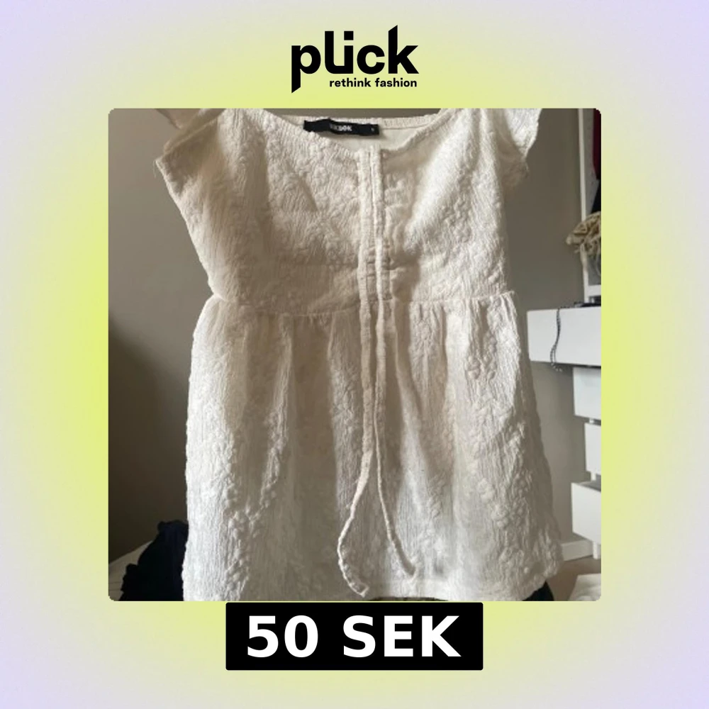 Supersöt vit blus från BikBok med broderad spets och knytband framtill.Tröjan har korta ärmar och en lätt volang vid axlarna. Perfekt för alla tillfällen och har en romantisk vibe med sin strukturerade spets och feminina siluett.