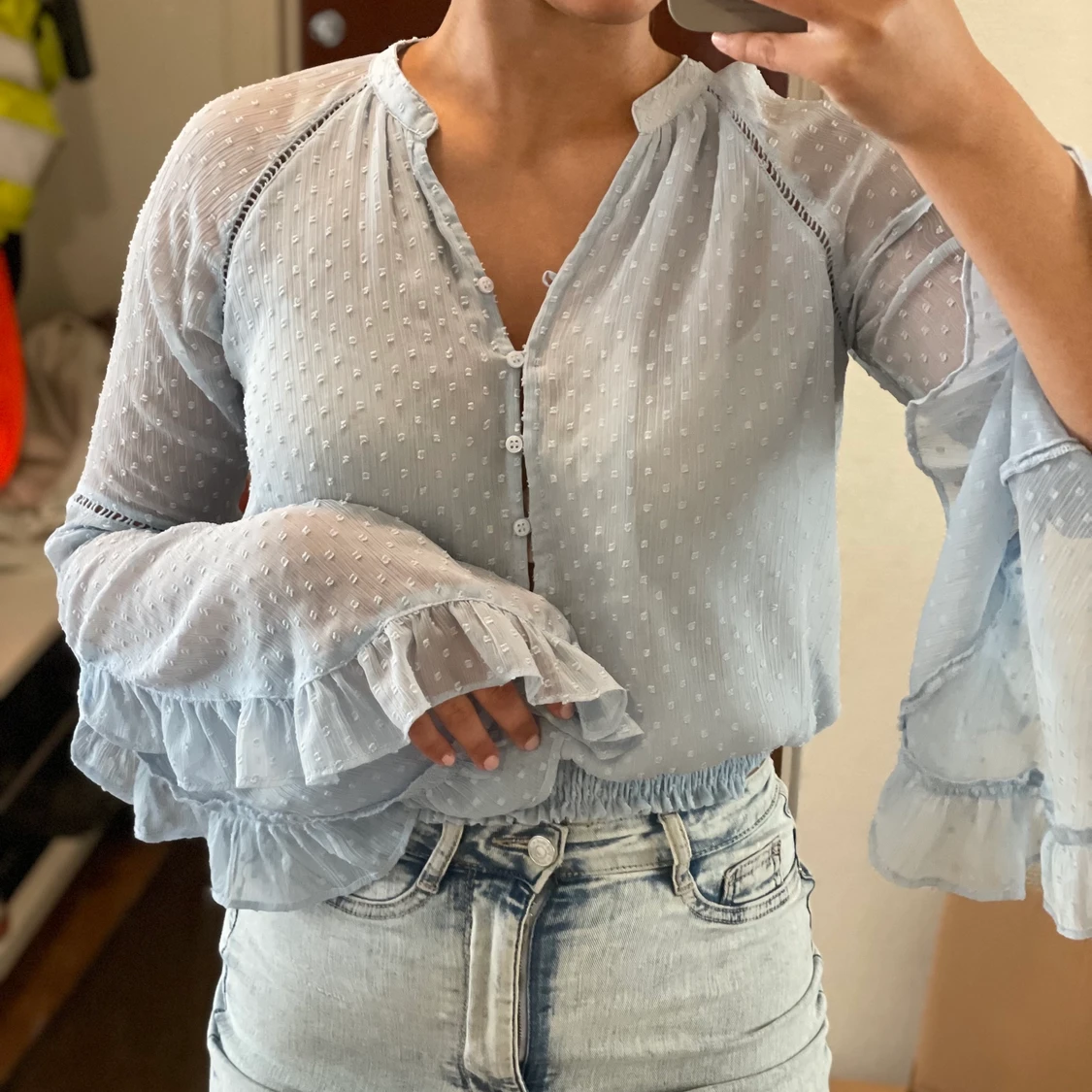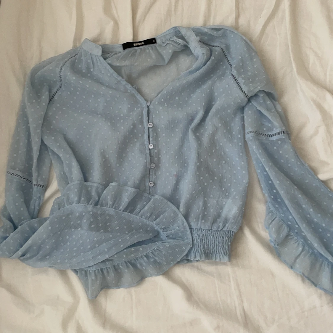 En ljusblå blus ifrån Bikok som har öppna armar med ”volanger”. Det är resår längst ner som ger blusen en ”puffig” effekt. Storlek S. Frakt ingår🌸