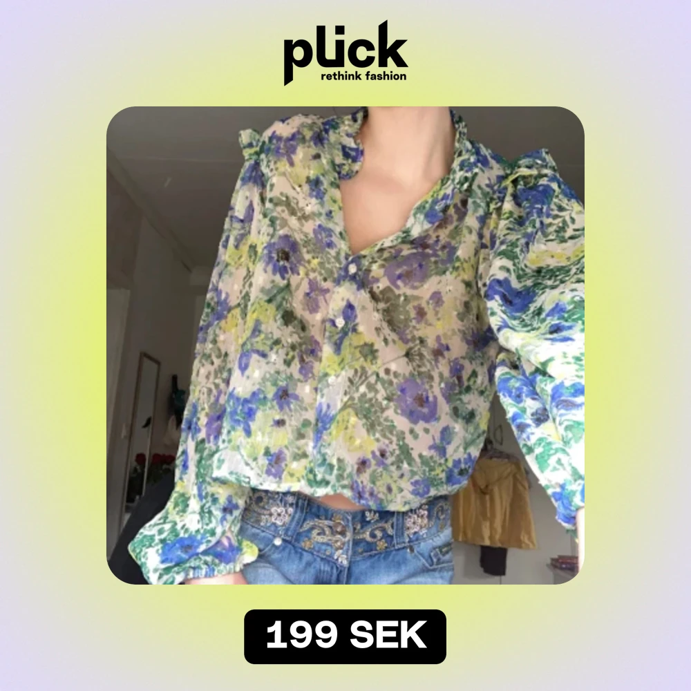 så fin grön/blå/gul blommig blus med puffiga ärmar och gulliga detaljer 🌸 Volanger runt urringningen. Kanppar på framsidan så att man knäppa upp den så mycket man vill. Jätte skönt och luftigt material! Har endast använt 1 gång så den är som ny!🌸