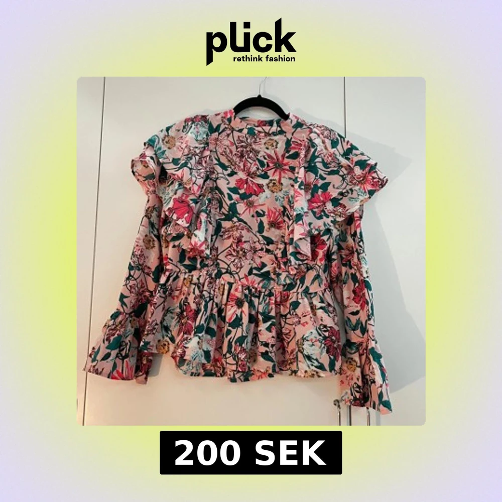 Säljer en blommig rosa blus från Gina Tricot med volangdetaljer runt midjan och vid ämarna samt handleden. Den har en rund halsringning, knappar vid ryggan samt små slits vid ändan av ärmarna. Färgen är mycket ljusare och mer livlig i verkligheten, vid intresse kan skicka fler bilder. Har används ett få antal gånger, men inga synliga tecken på det. Storleken är 38. Priset kan diskuteras.