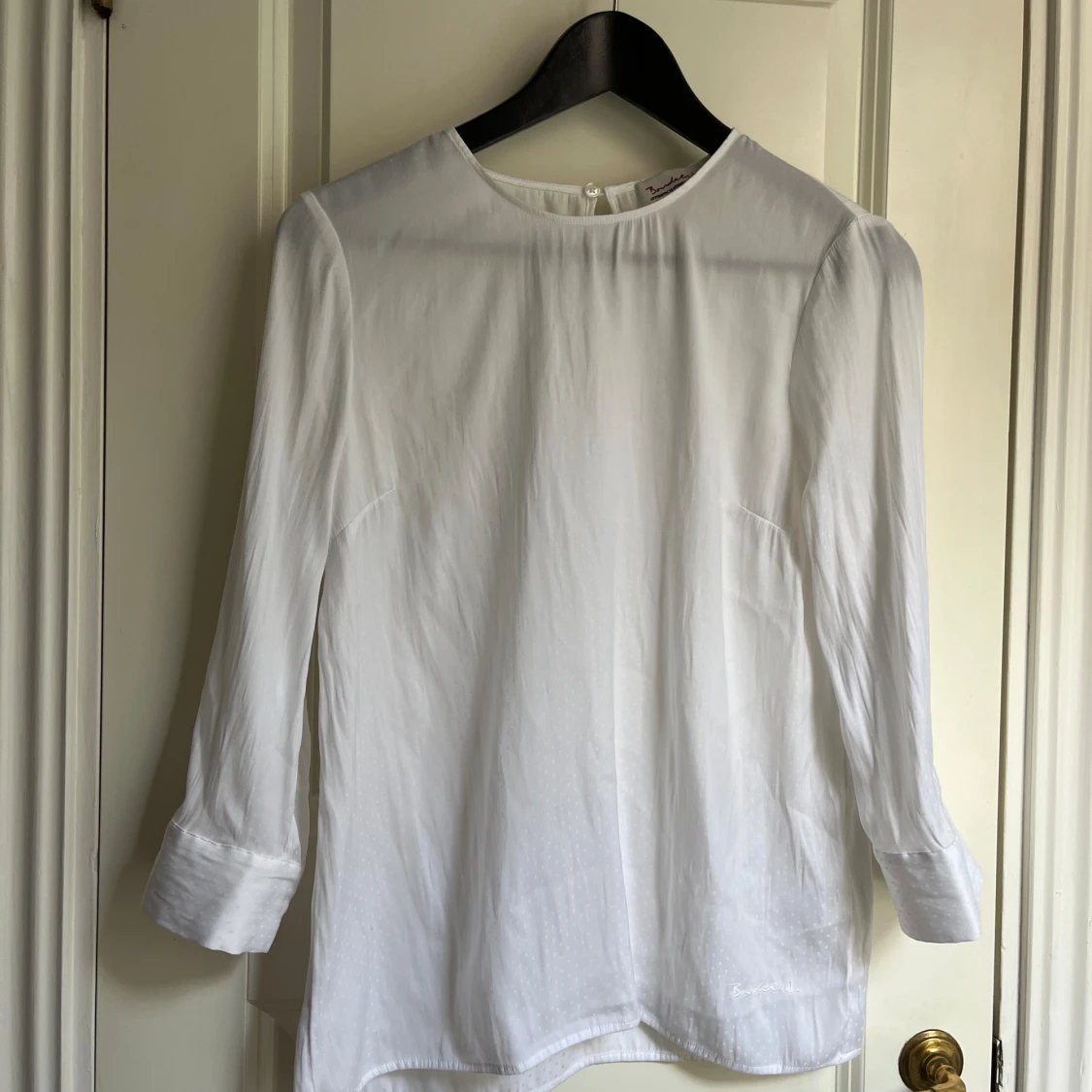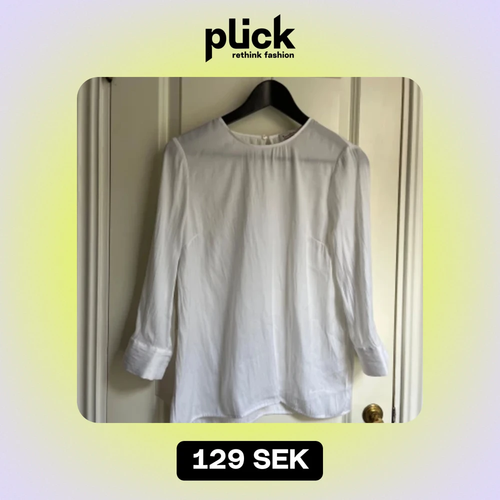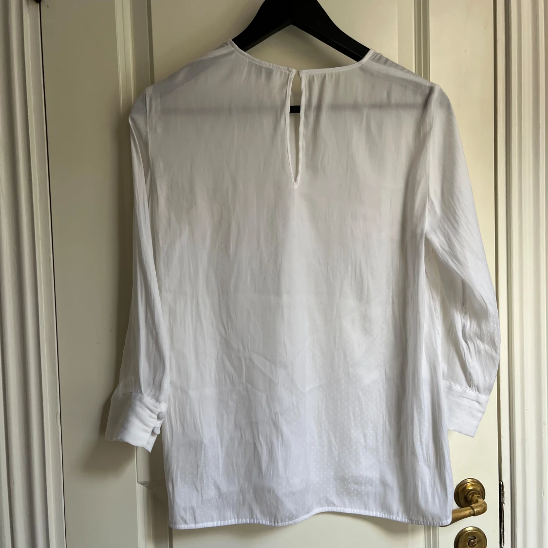 En vit blus med långa ärmar och rund halsringning. Blusen har en liten slits i ryggen.