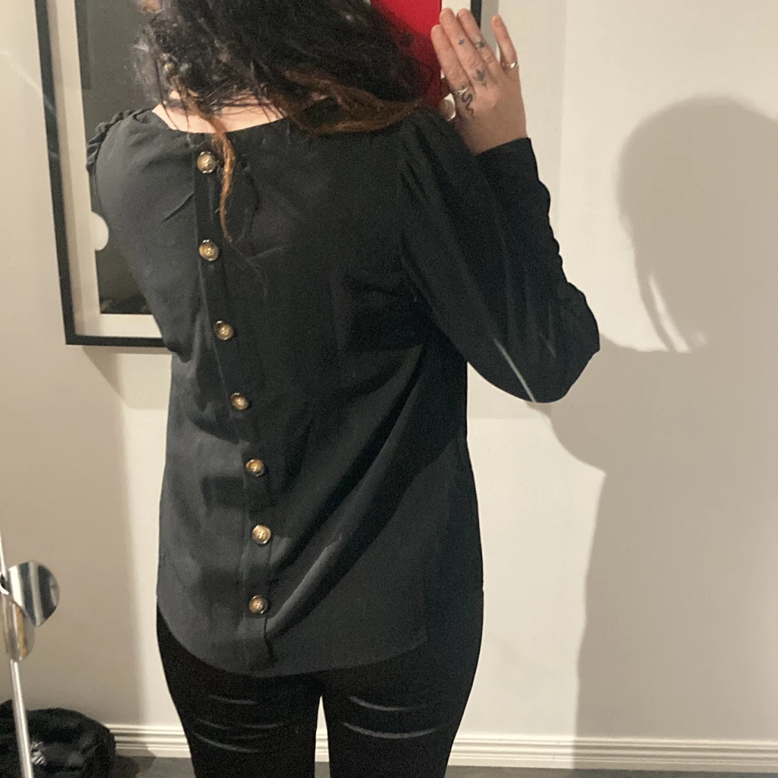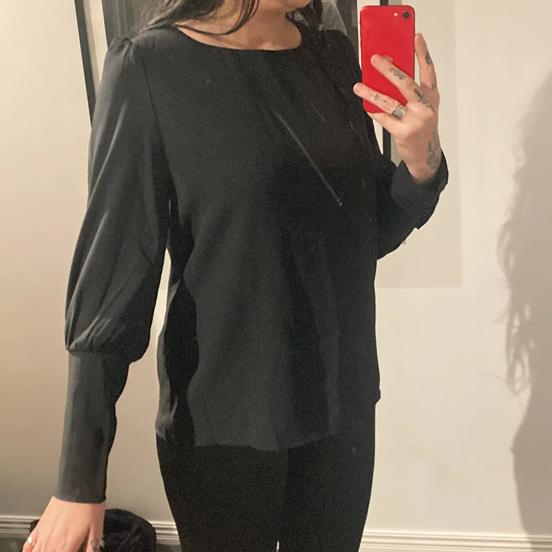 Jättefint svart blus med lite puffigare ärmar som smalnar av med knäppning nere. Samma knäppning i ryggen. Aldrig använd men storlekslappen är tyvärr borta. Jag på bilden är strl. S-M.