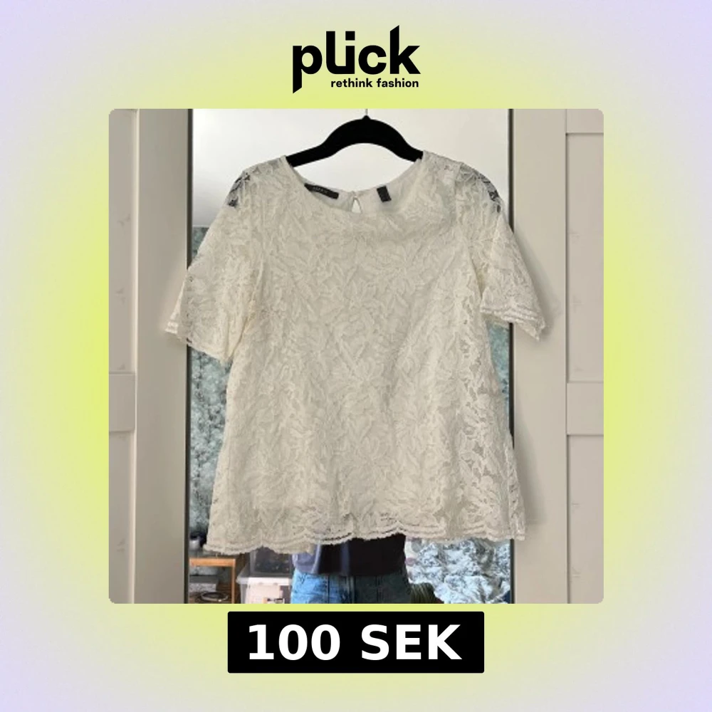 Vit tröja med tunn innerdel och utsida i spets. Öppen spets i ryggen och endast spets på ärmarna. Storlek: S. Material insida: 100% viskos. Material utsida: 59% polyamid och 41% polyester. I använt skick men inga skador!