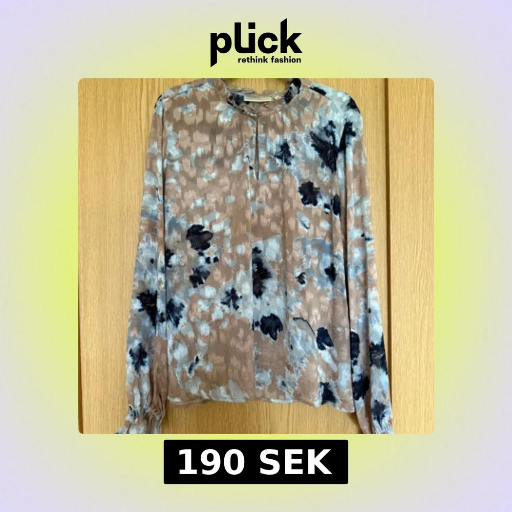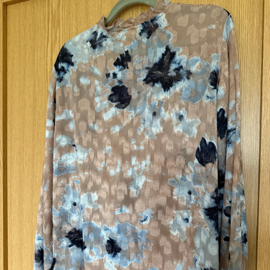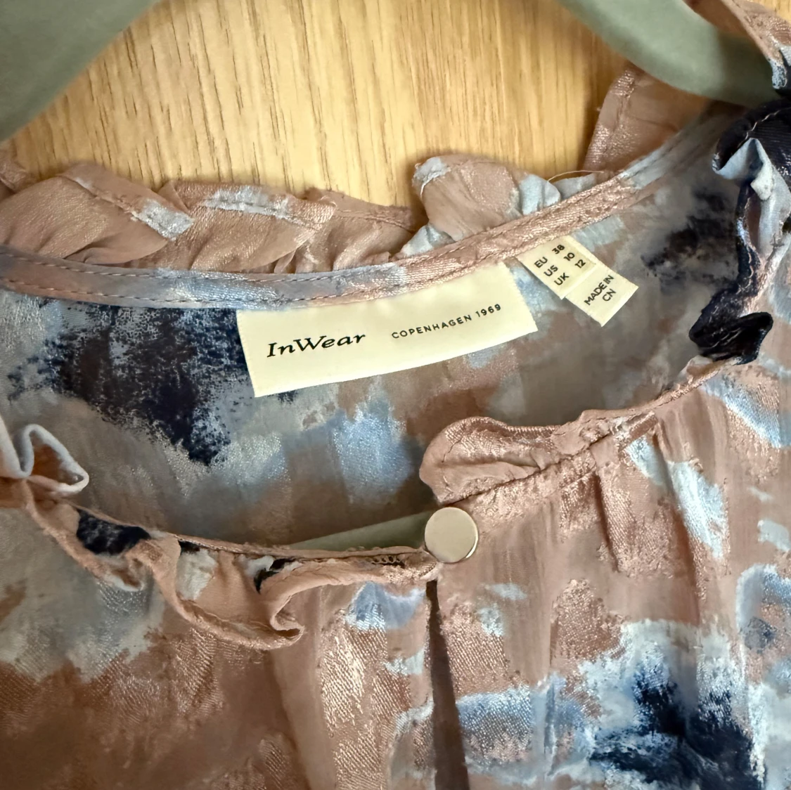 Tunn beige blå polyesterblus från InWear. Volangdetaljer i krage och ärmslut. En knapp i halskragen men är lika snygg oknäppt. Endast använd en gång.