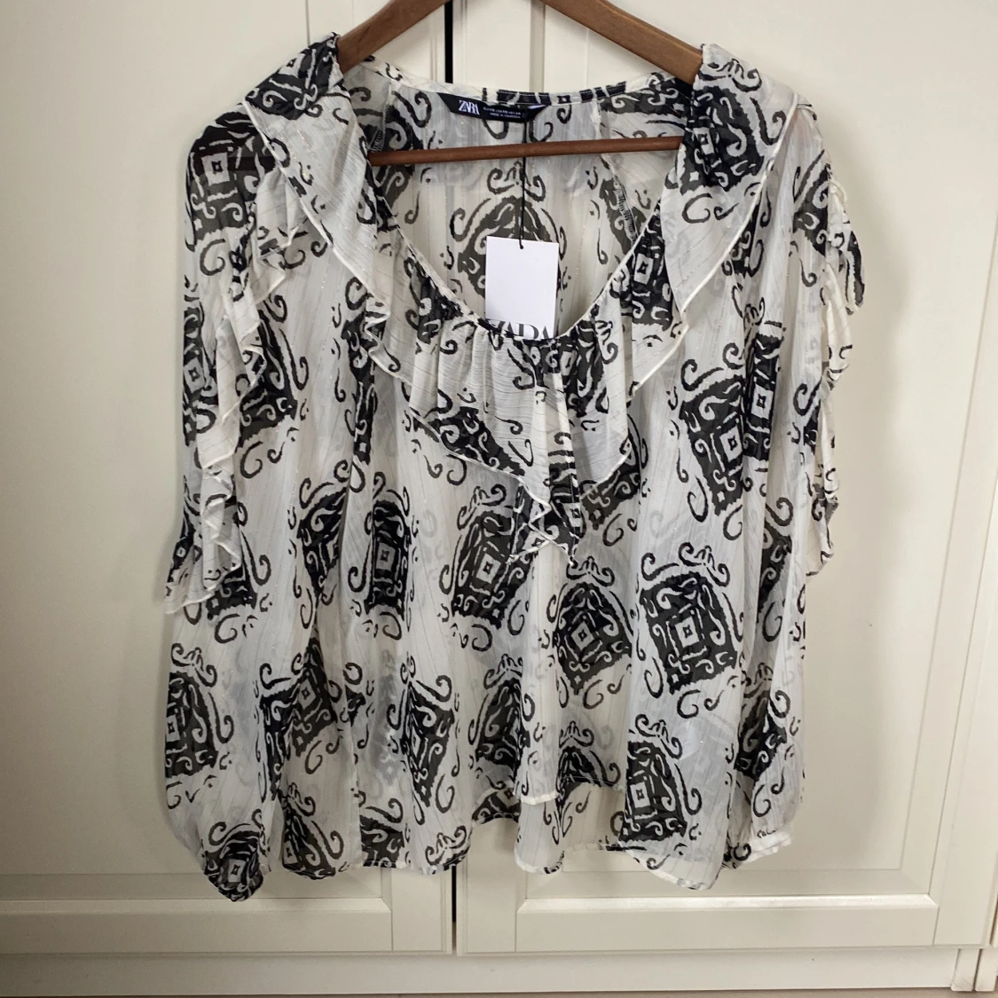 En fin blus från Zara, den är luftig och skön mot huden. Den är v ringad. Lappen är kvar, köpt för 329kr säljer för 250kr. Storlek XS men lite stor i storleken så passar fint för S också