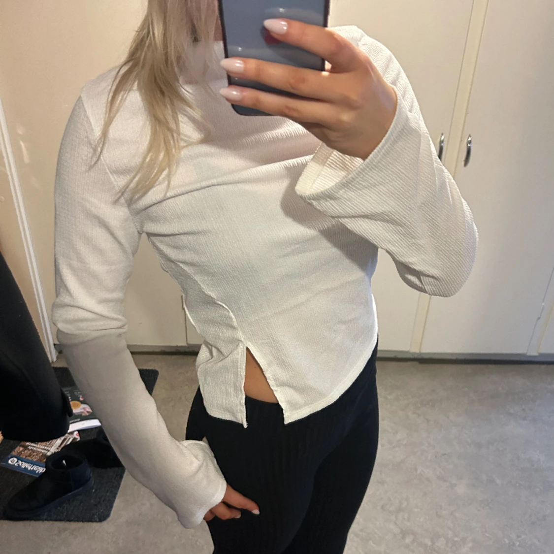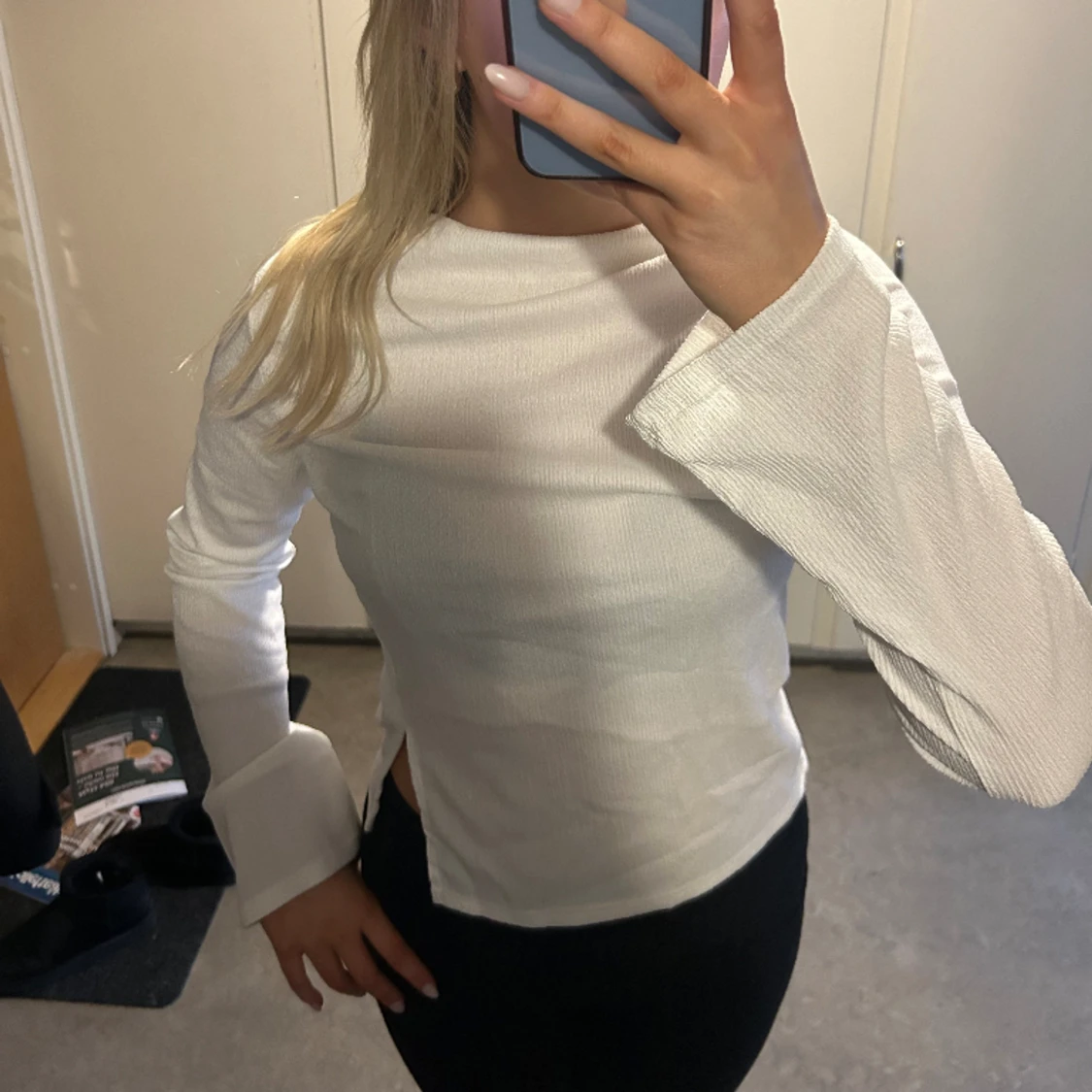 Långärmad vit topp från Gina tricot💓 Strl S. Endast använd en gång, fint skick. Den har utsvängda armar, slits ner till vid magen (sista bilden). Den är även rak uppe vid halsen.