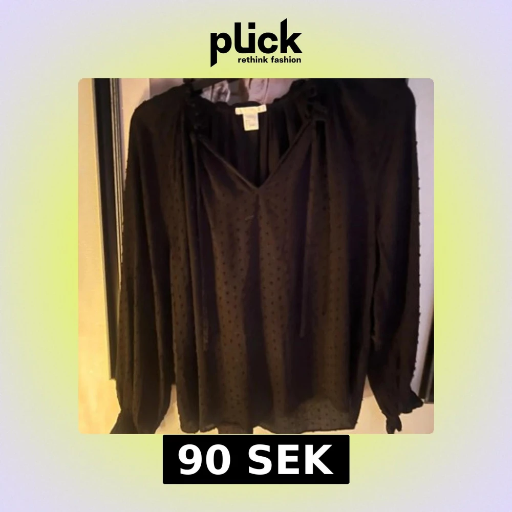 Säljer en svart blus med diskret prickigt mönster och v-ringning. Blusen har långa ärmar med resår vid ärmslut och knytband vid halsen. Tunt, lätt material som ger en luftig känsla och snyggt fall.