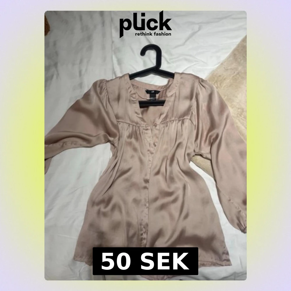 Säljer en snygg beige blus från H&M i glansigt satinliknande material. Blusen har v-ringning, knappar framtill och långa puffärmar. Perfekt för dig som gillar en stilren och trendig look.