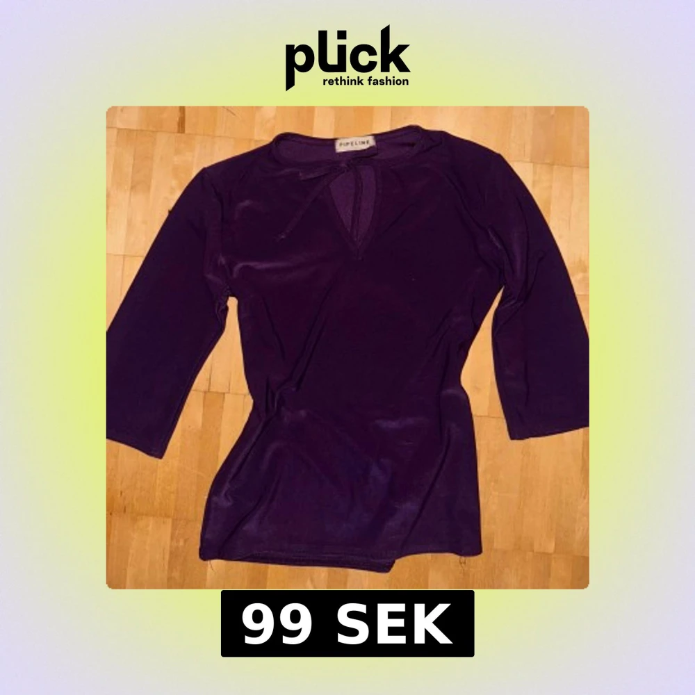 Säljer en snygg unik lila blus från Pipeline med trekvartsärm och v-ringning med knytband vid halsen. Toppens material har en lätt glansig finish som ger en cool look.