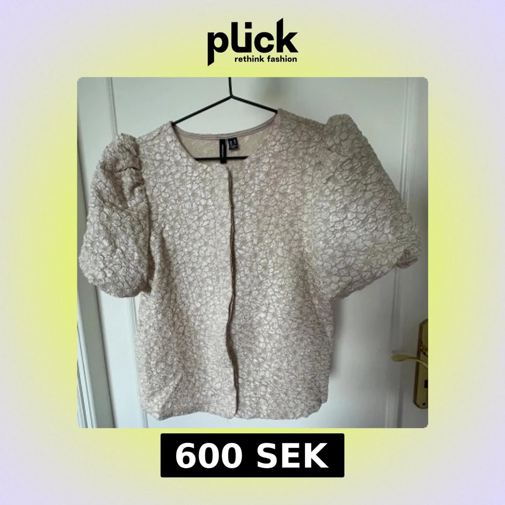 Kortärmad blus i beige/chanpange från veromoda som inte finns att köpa längre. Jackan har puffiga ärmar och ett blommigt mönster i strukturen, rund halsringning och dold knäppning framtill. Perfekt för dig som vill ha något unikt och stilrent med en twist. Funkar både som bolero och blus. Passar XXS-S. Använd en gång
