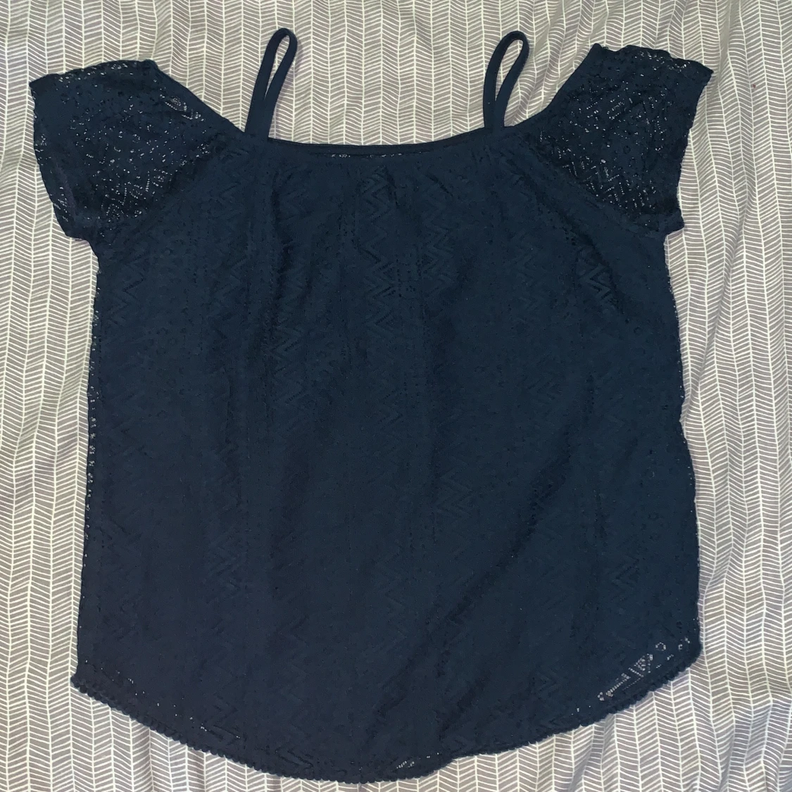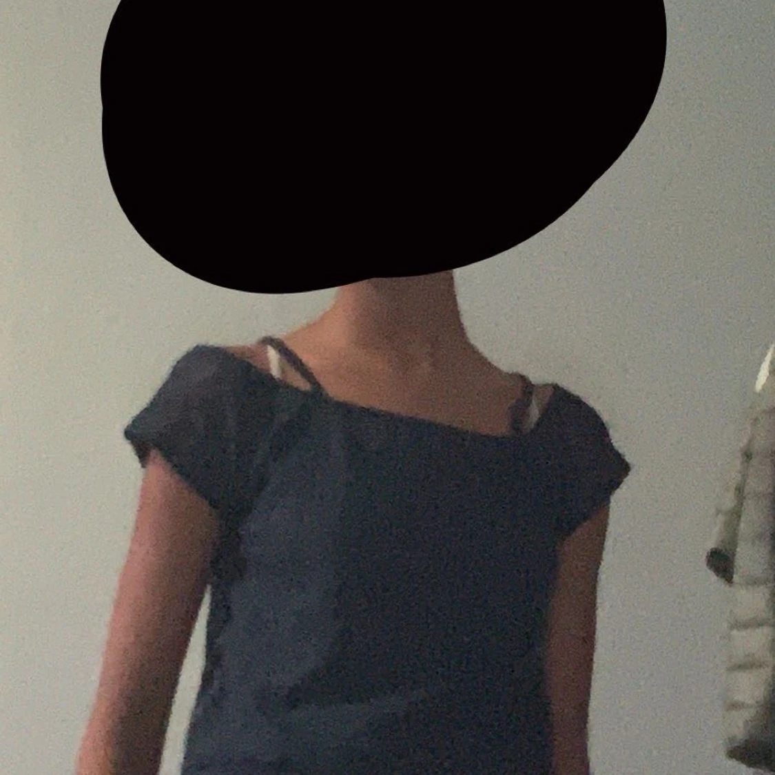 En mörkblå blus som har blivit använd flera gånger fast är i bra skick. Och den är väldigt elastisk vid axlarna.