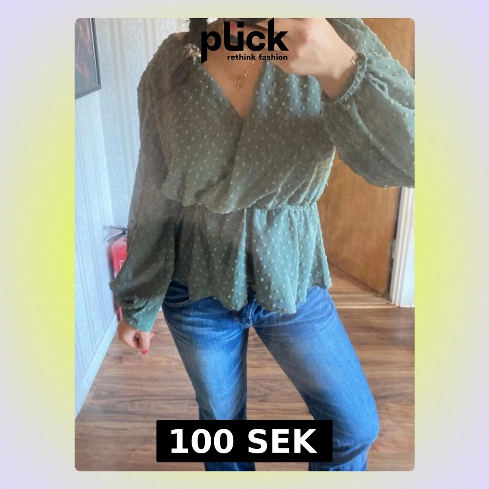 Stilren grön omlottblus med lång ärm och markerad midja. Blusen har en prickig struktur i tyget och lätt puffade axlar för en trendig look. Perfekt att matcha med jeans eller kjol för en snygg outfit.