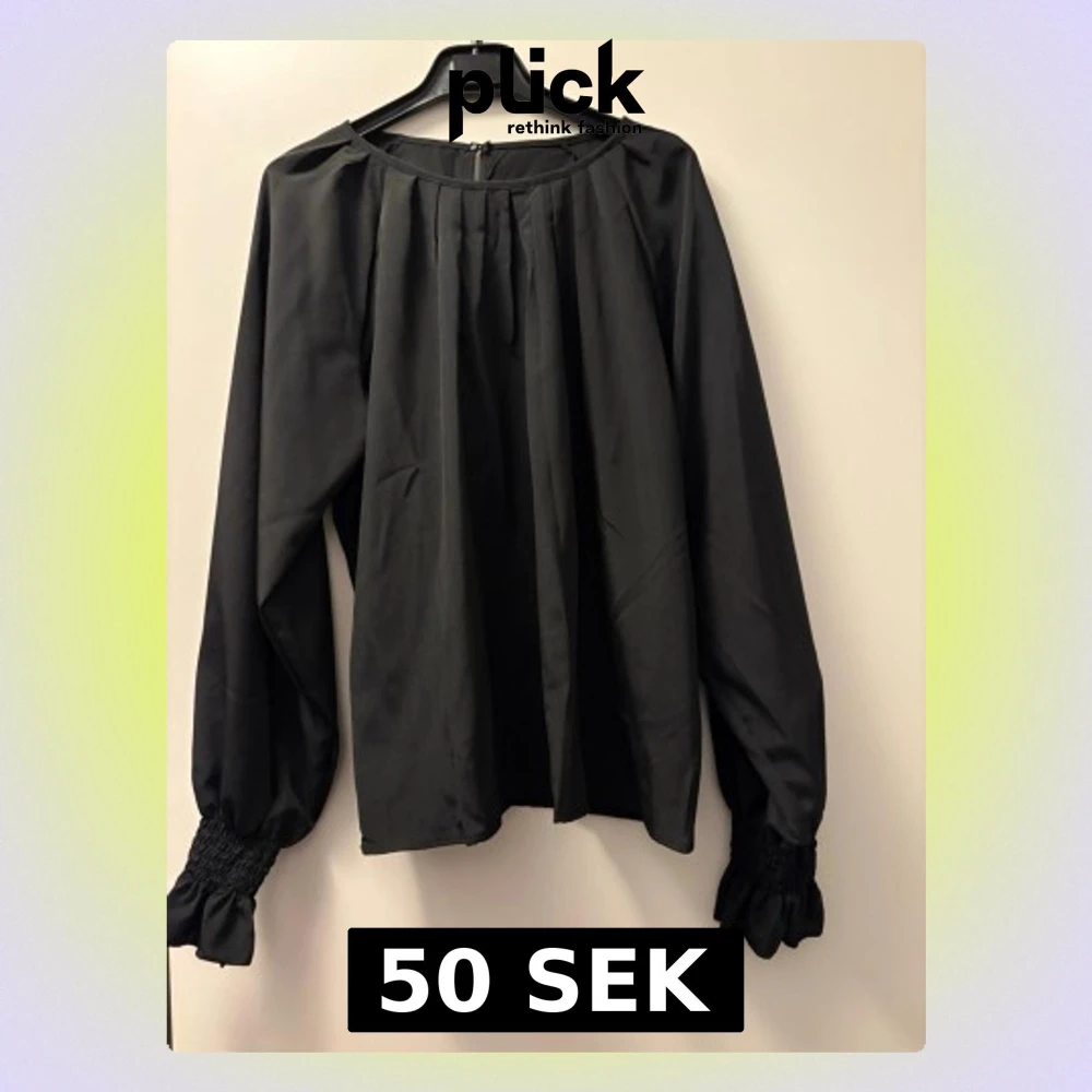 Stilren svart blus med rund halsringning och långa puffärmar med smockdetalj vid ärmslutet. Blusen har en lätt glansig finish och stängs med en liten knapp i nacken. Aldrig använd
