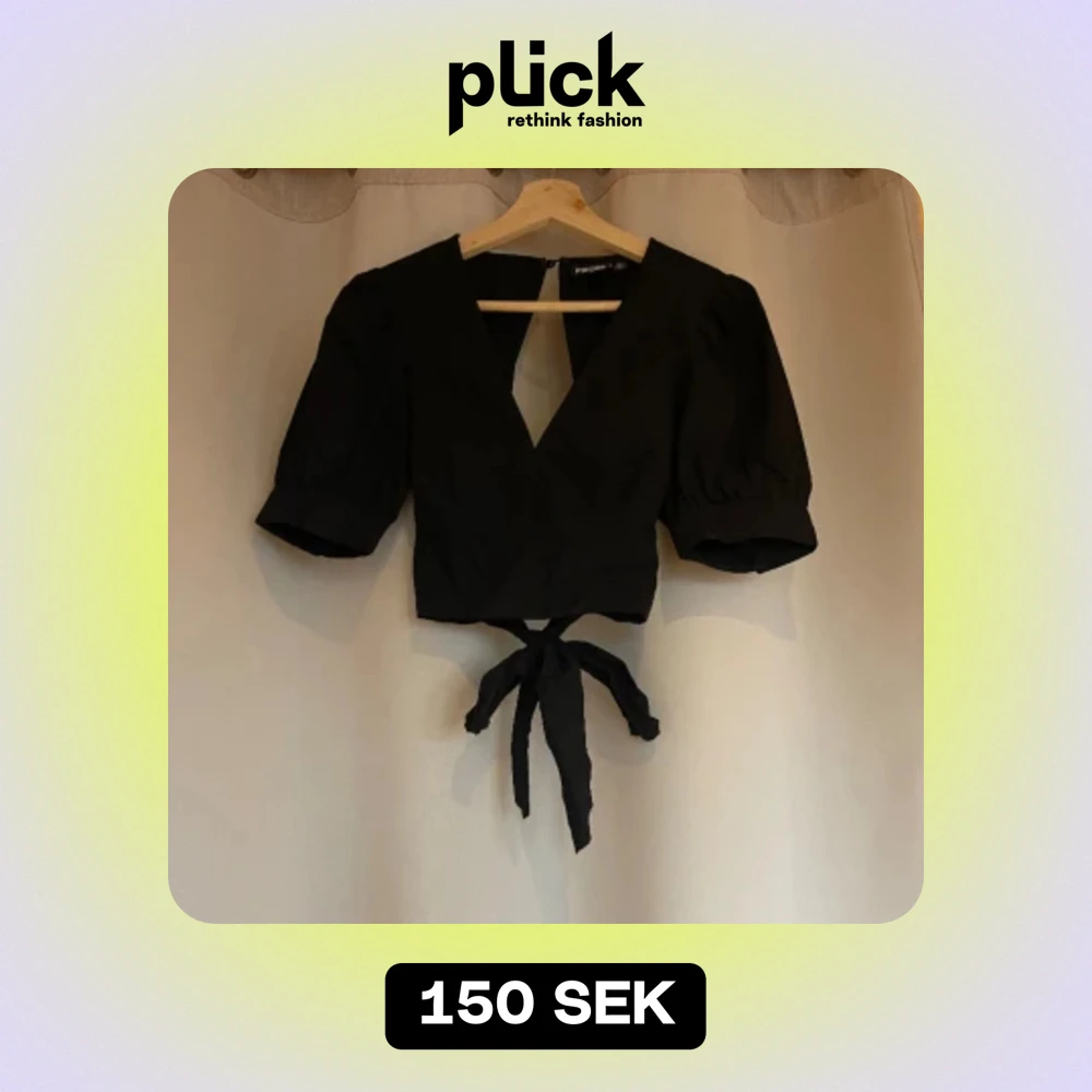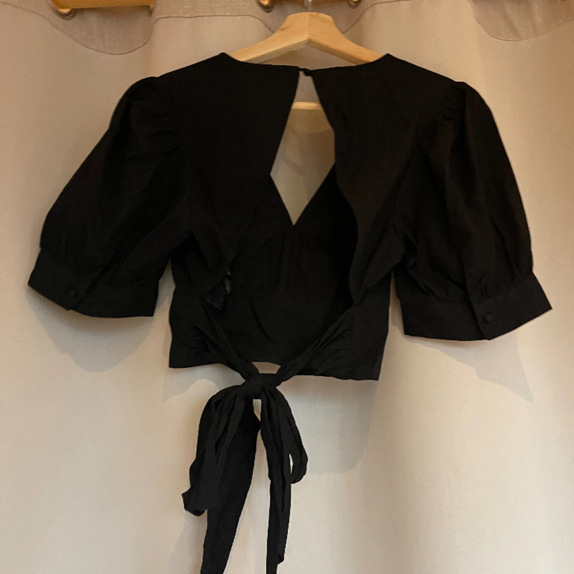Söt svart blus med v-ringning och öppen rygg med knyte! Strl XS