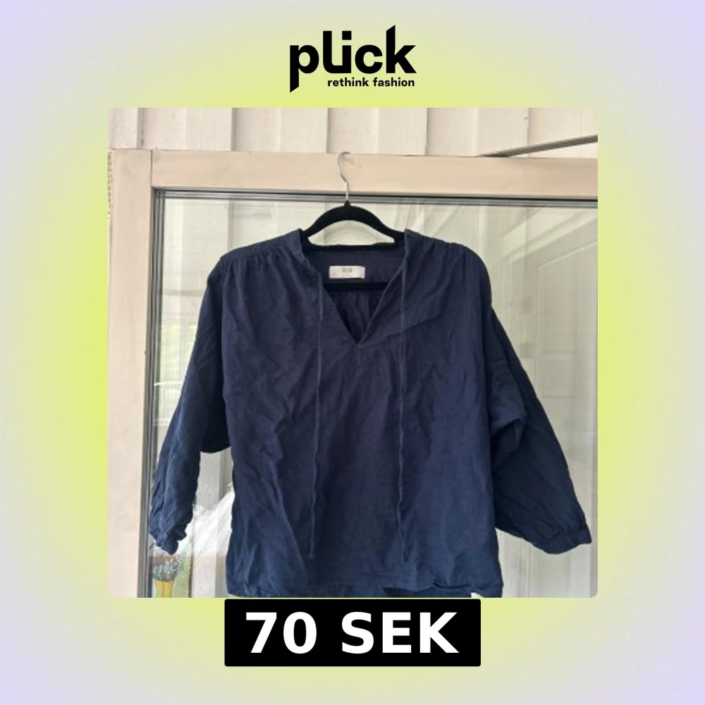 Snygg mörkblå blus från Uniqlo i luftig linnemix. Blusen har v-ringning med snörning och trekvartsärmar med lätt puff. Storlek S. (Bra skick, näst intill oanvänd)