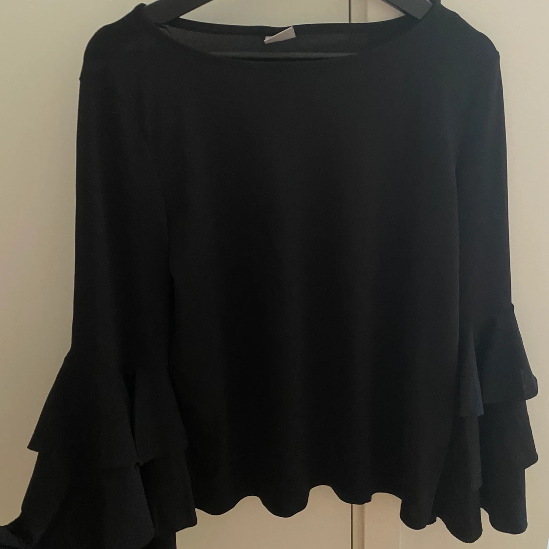 Svart blus i tunt tyg, med fina ärmar. Matchar till allt och är i nyskick! Passar M/L.