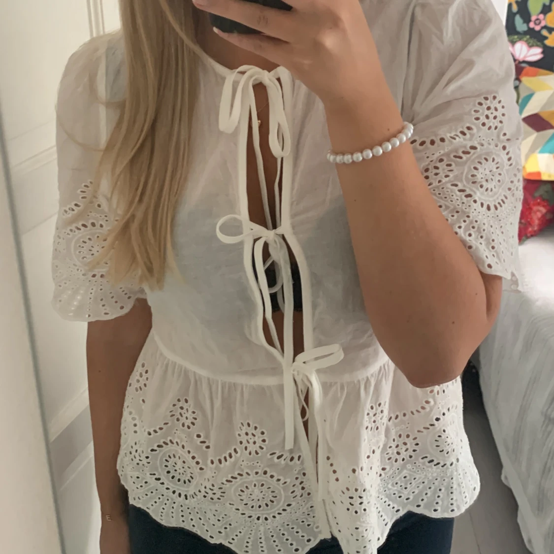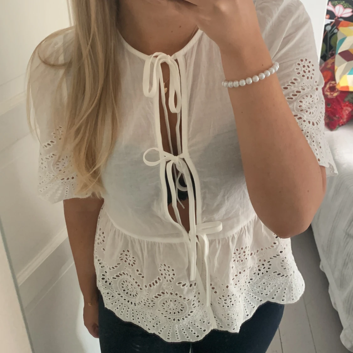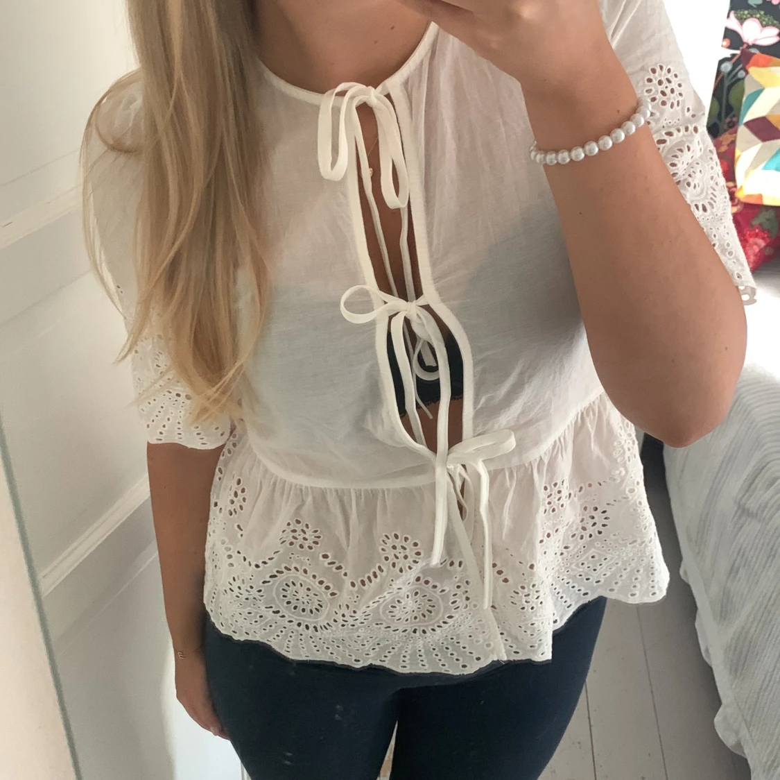 Så så fin vit blus som tyvärr är lite för liten för mig. Storlek L på lappen men som en liten M.