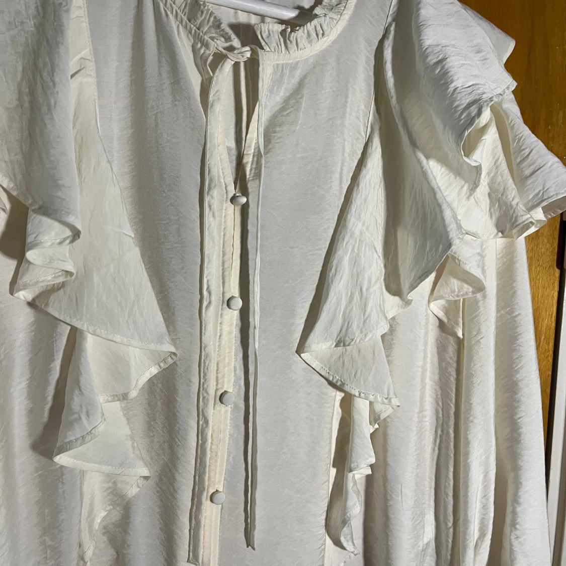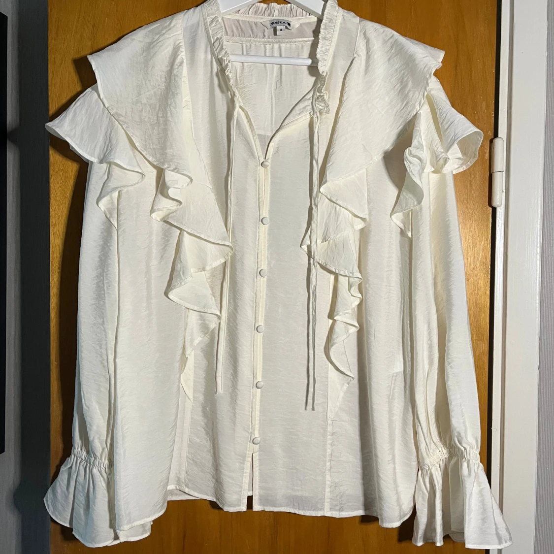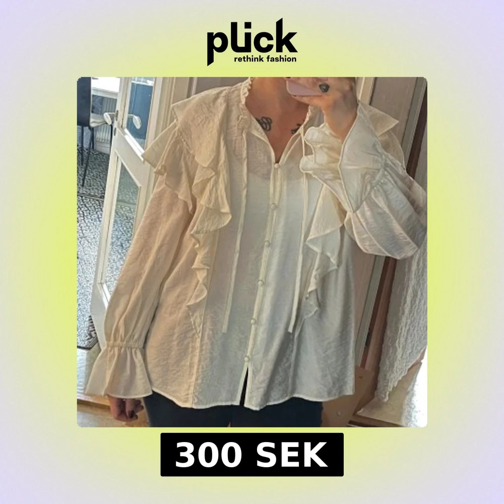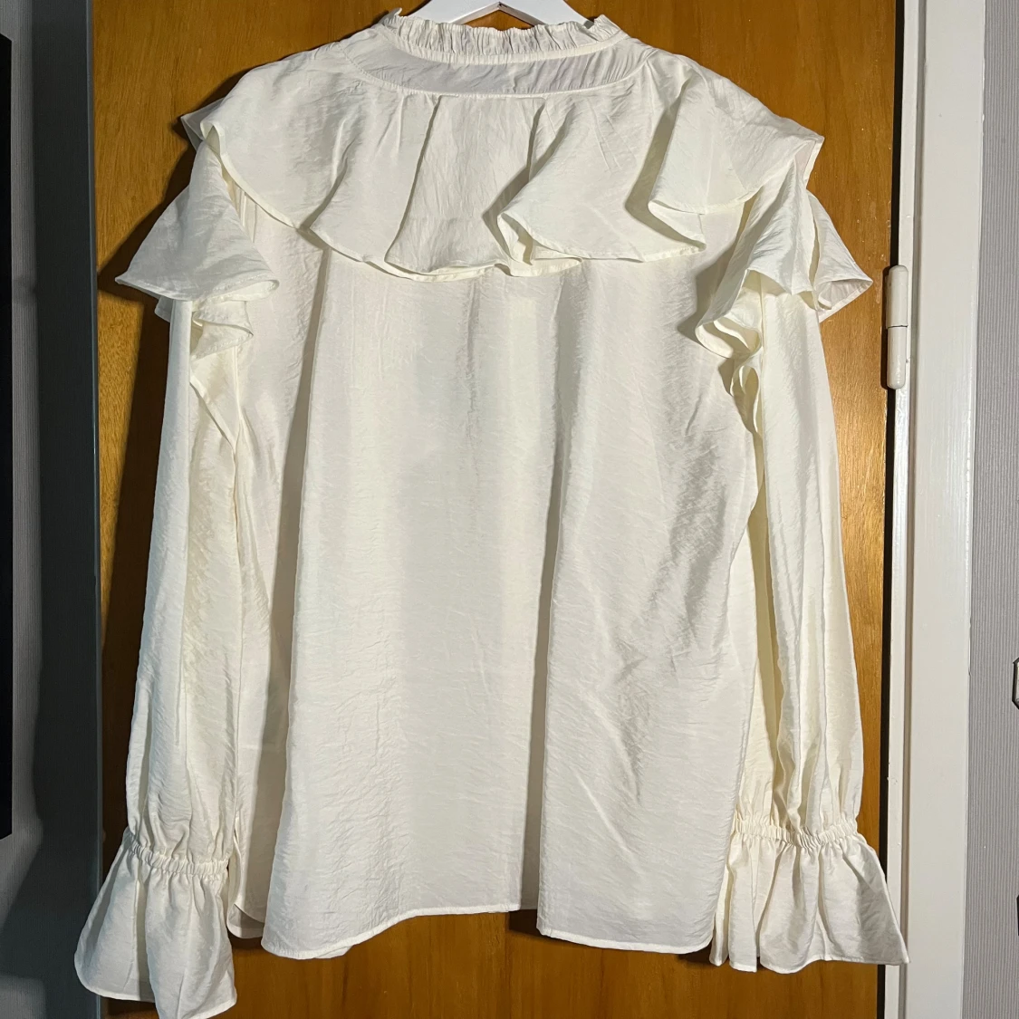 Skjorta med volanger längs axlar och bröst, knappar framtill och långa ärmar med volangdetalj vid ärmslut. Skjortan har en lätt glansig yta och en relaxed fit.